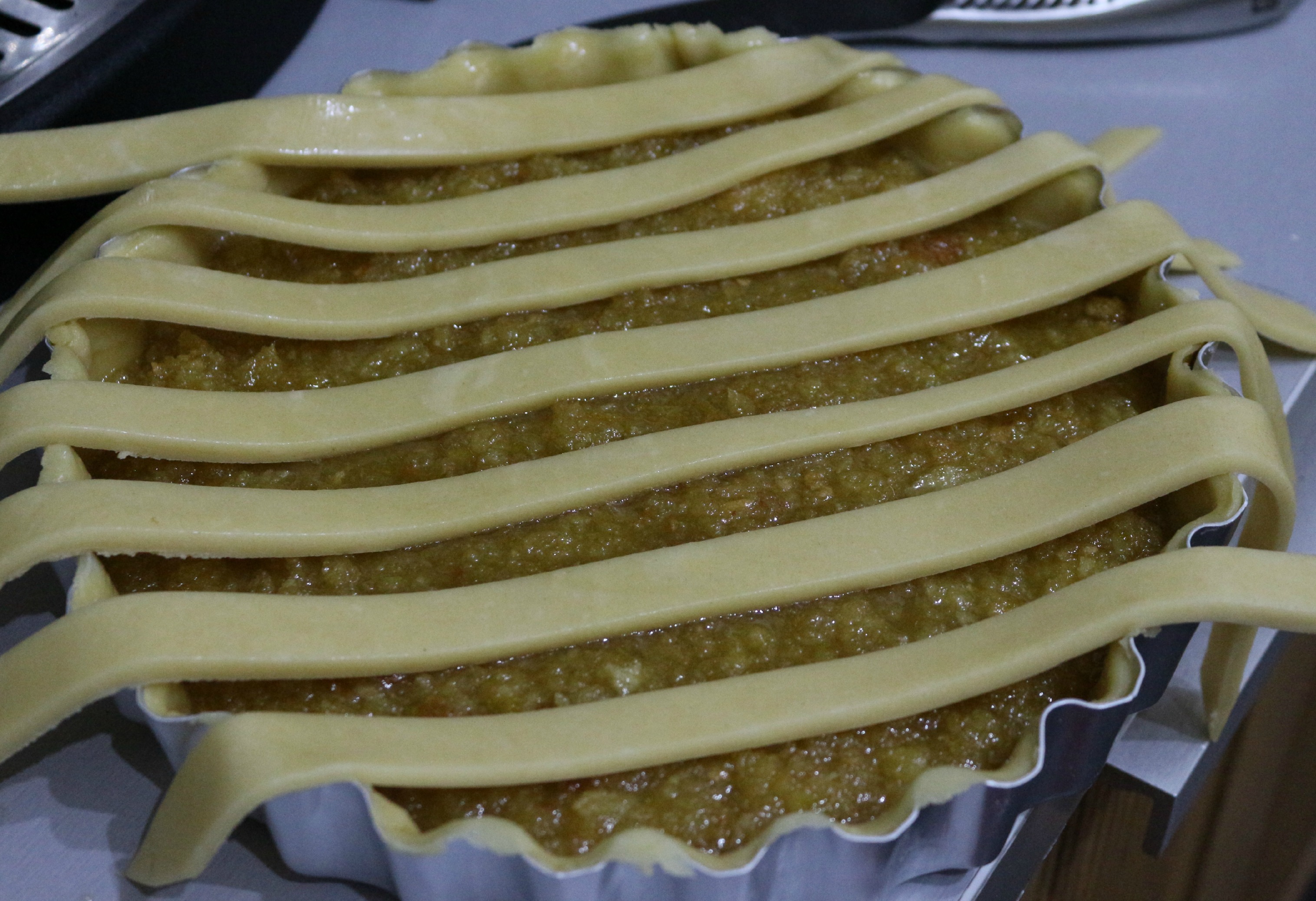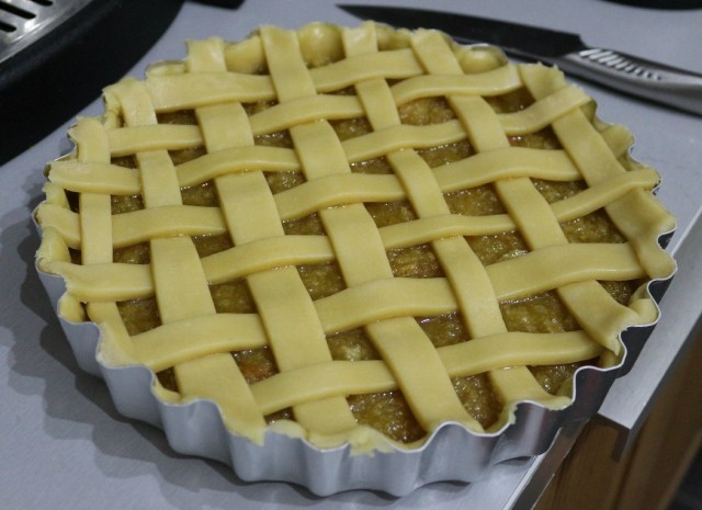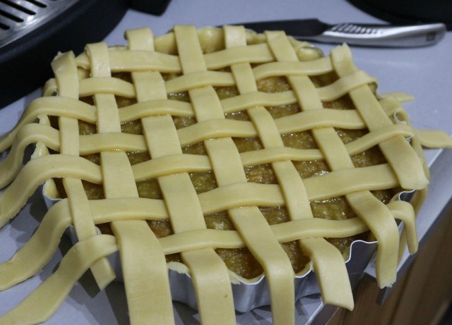I used my Pizza wheel to cut strips from the reserved pastry (note: it has already been egg washed at this point), then laid strips horizontally across the top, then started to add the verticals. For each vertical strip, I just laid it across, then lifted the horizontal up and over. Then once this was done, trimmed the edges, and it was done!