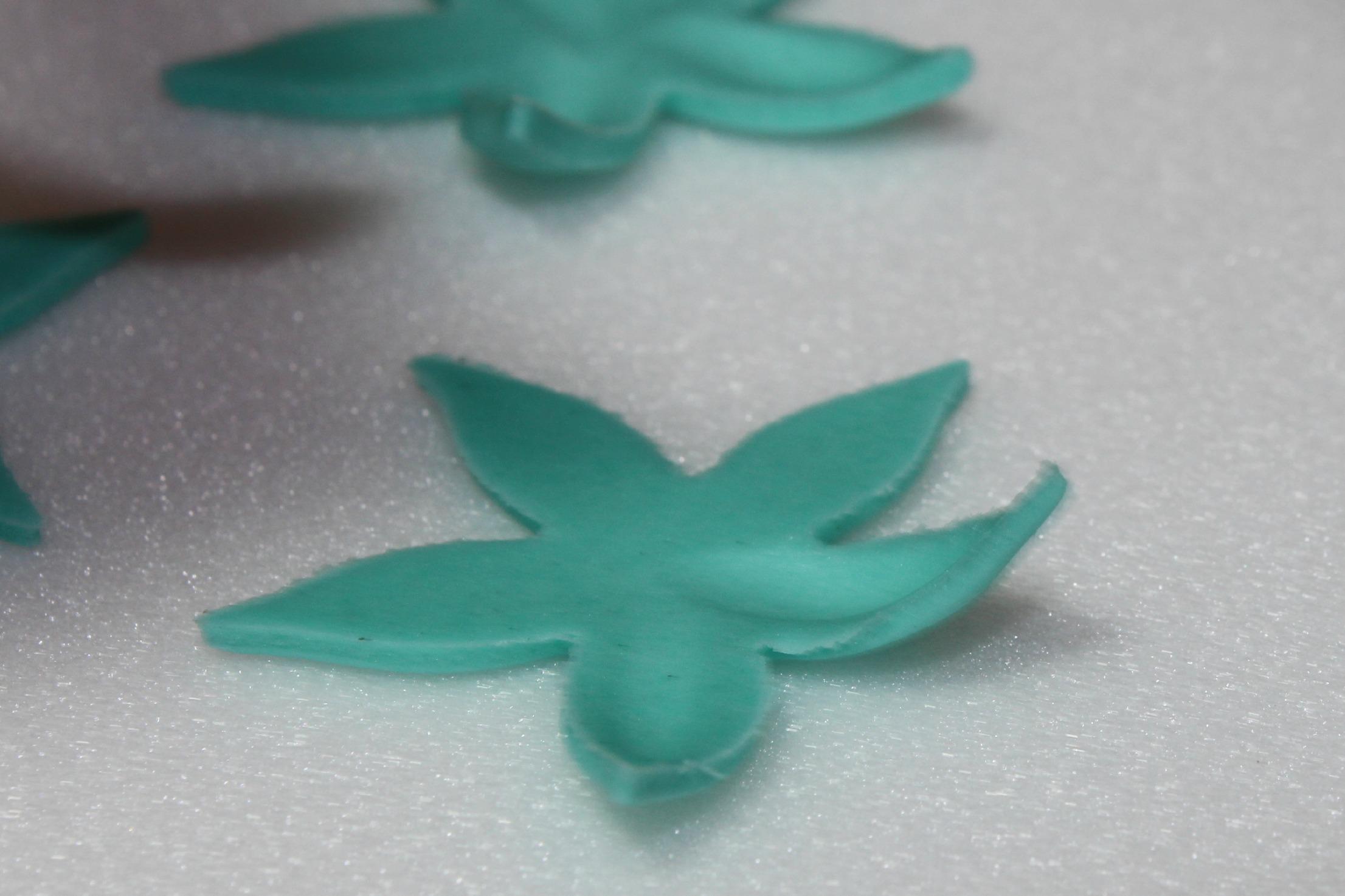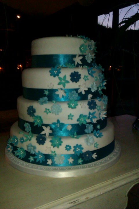 A few months ago my friend’s sister saw a cake online that she wanted for her wedding, her mum and sister-in-law were baking the cake, but she couldn’t make the flowers as she didn’t have the cutters. I can’t share the picture as it’s copyrighted, but it had five point calyx and daisy flowers, arranged up the side of four tiers of white fondant covered cakes, with a teal ribbon around the base of each.