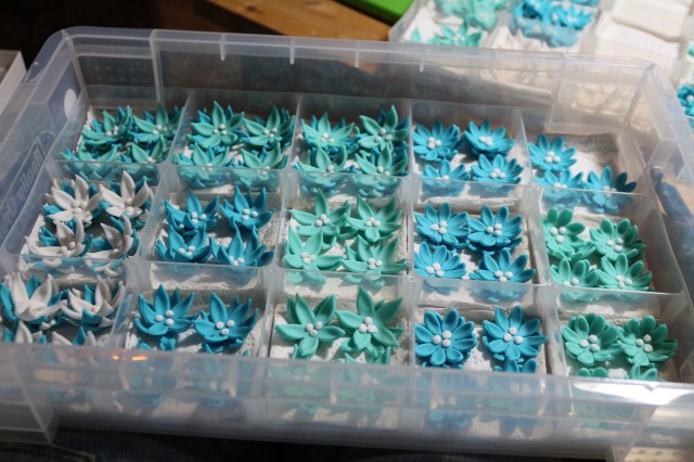 Here you can see some of the daisy cut flowers too, and on the lower rack, some two-tone turquoise flowers, made with two layers of 5 point calyx flowers, and in the middle, some turquoise and white flowers.