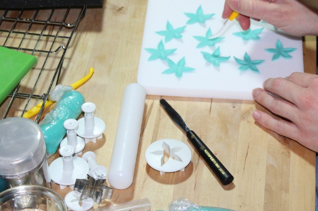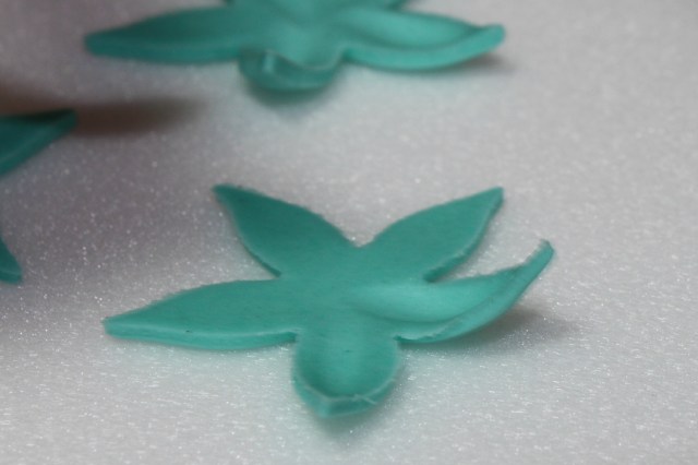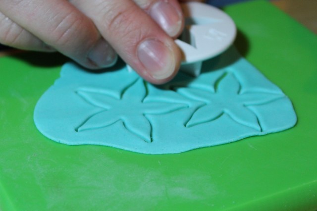 I had added some gum tragacanth to some regular fondant to firm it up, then rolled it out and cut out the flowers:
