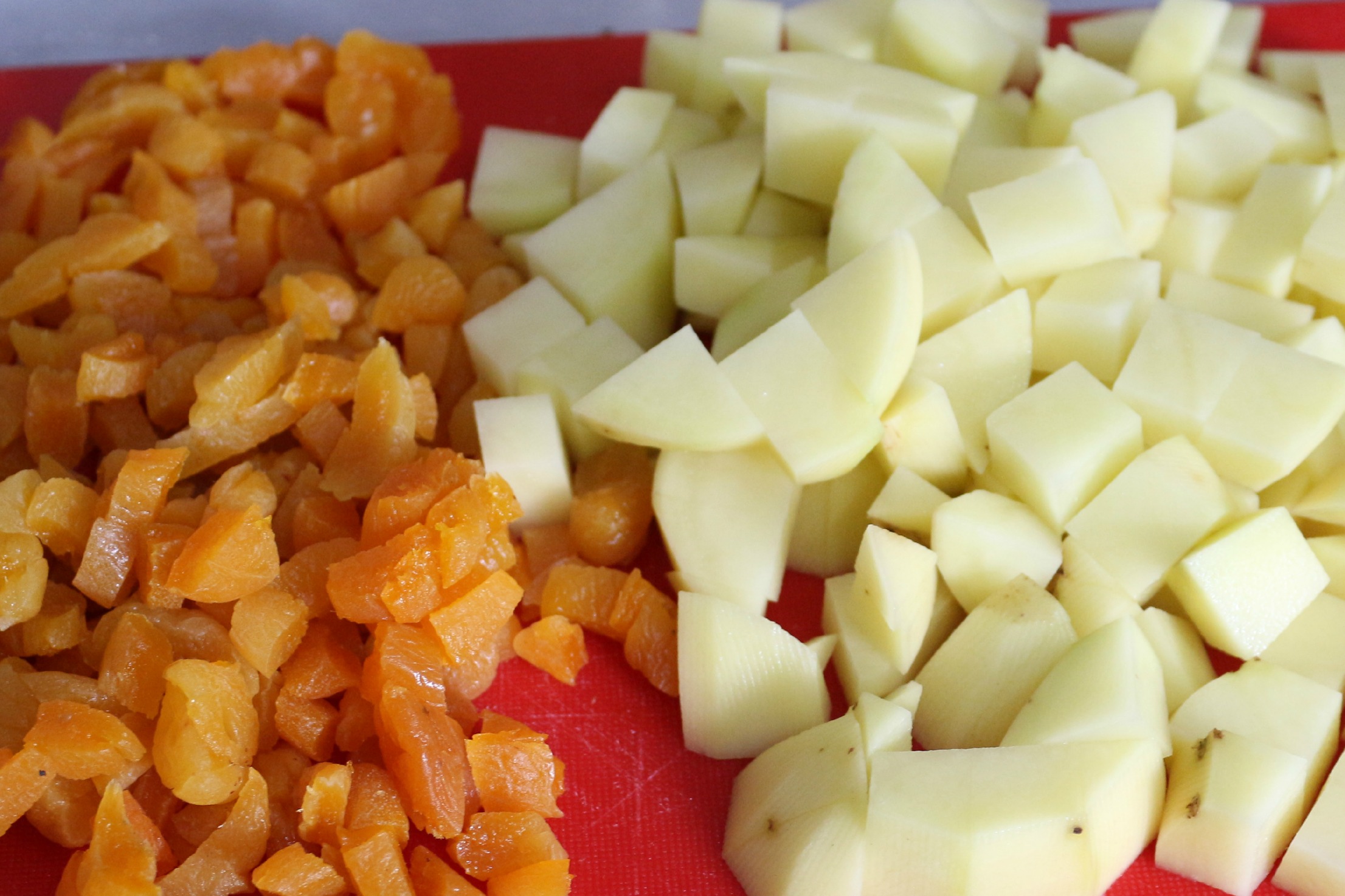 In a large bowl, combine the cheese and dried rosemary until it forms a smooth paste, and assemble the chopped potatoes and apricots (separately), ready to fill the pie cases.
