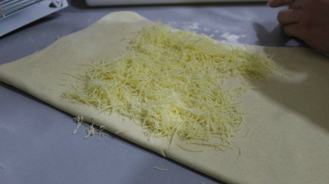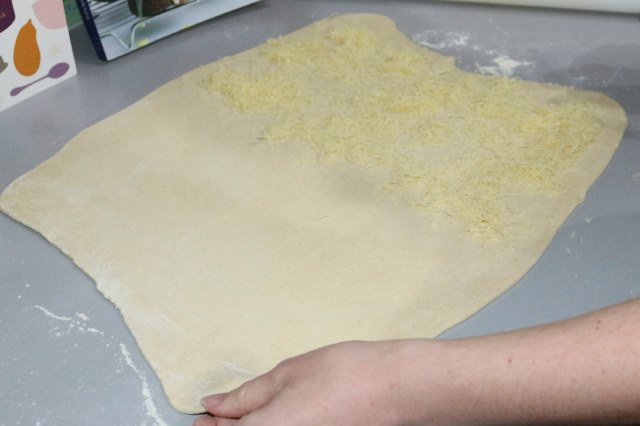 Roll out the pastry into a rectangle, then scatter half with some of the cheese: