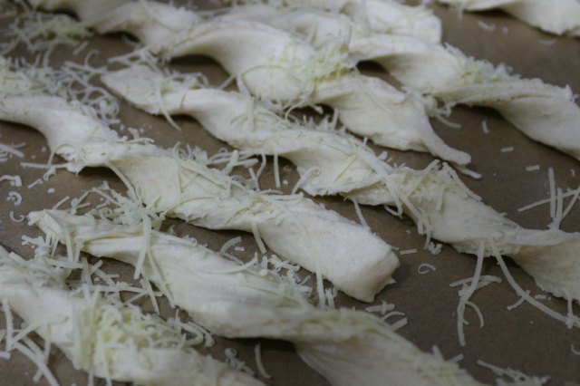 To make the Cheese Twists, finely grate 100g strong cheddar (or any other cheese you fancy), and proceed as follows!