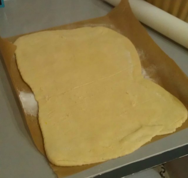 Take a sheet of baking paper and sprinkle with sugar, then roll out the pastry into a rectangle.