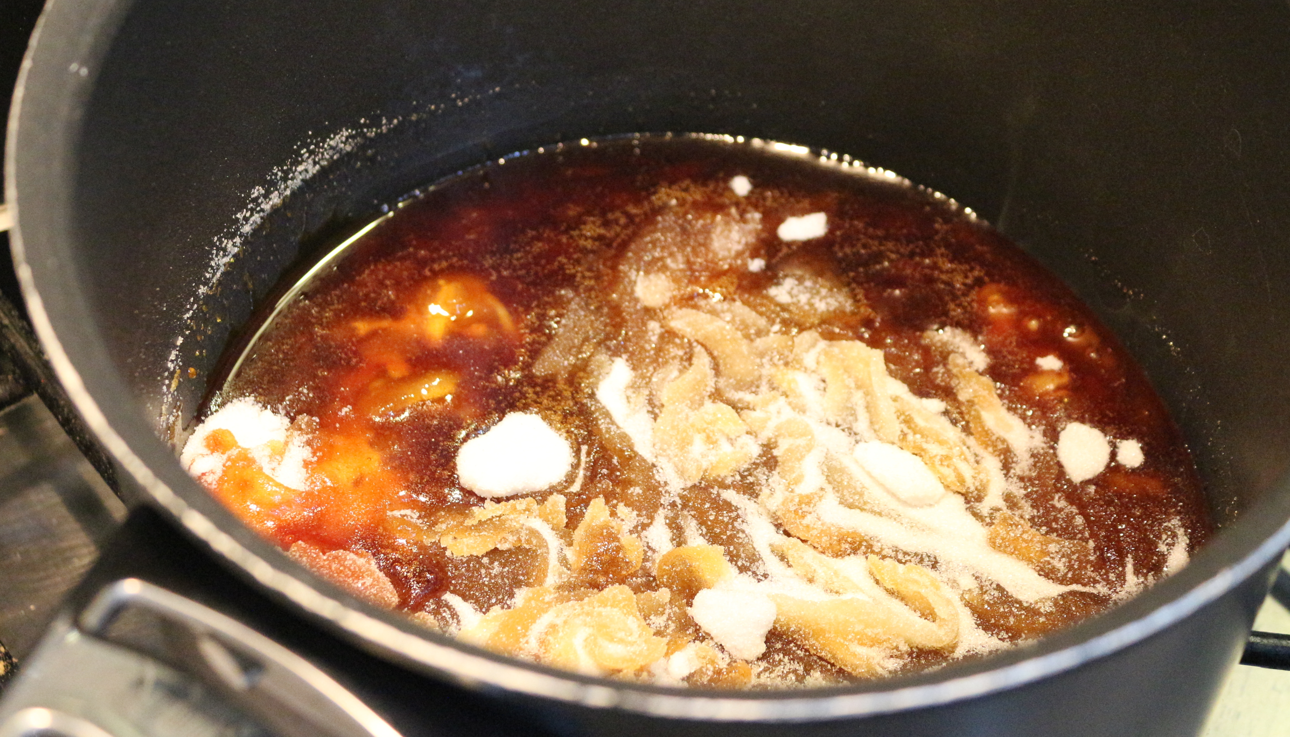 Put the caster sugar in a medium pan over a medium heat and leave until the sugar begins to dissolve and caramelise around the edges.