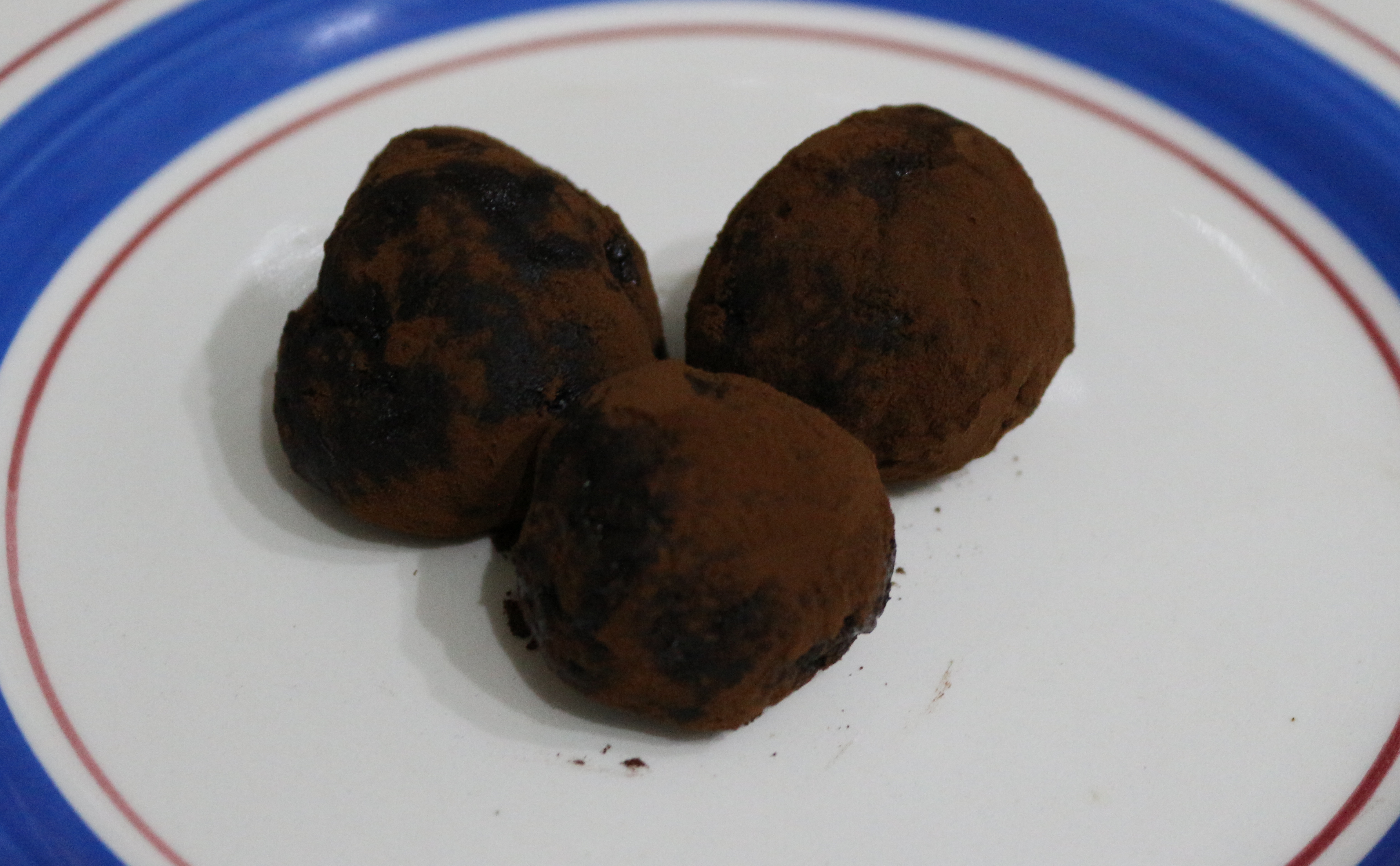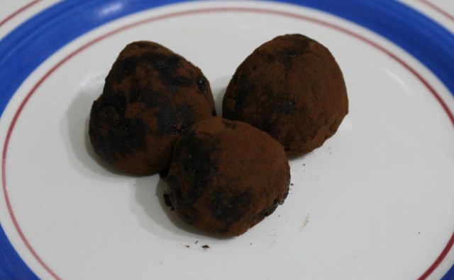 To make the truffles, have a small bowl of cocoa powder ready, and a baking tray lined with parchment. Take large teaspoons of the ganache mixture, roll into balls, then roll in the cocoa powder and set on the baking tray.