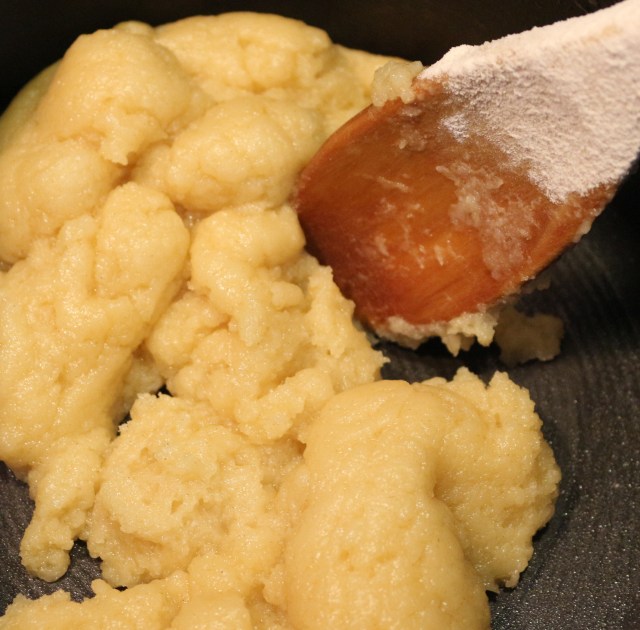Return to a low heat, and stir gently while the dough cooks gently and comes away from the sides to make a smooth, glossy, ball.