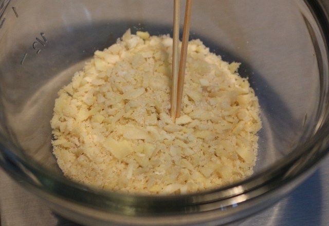 Prepare the chopped almonds in a dish or plate ready for dipping into.