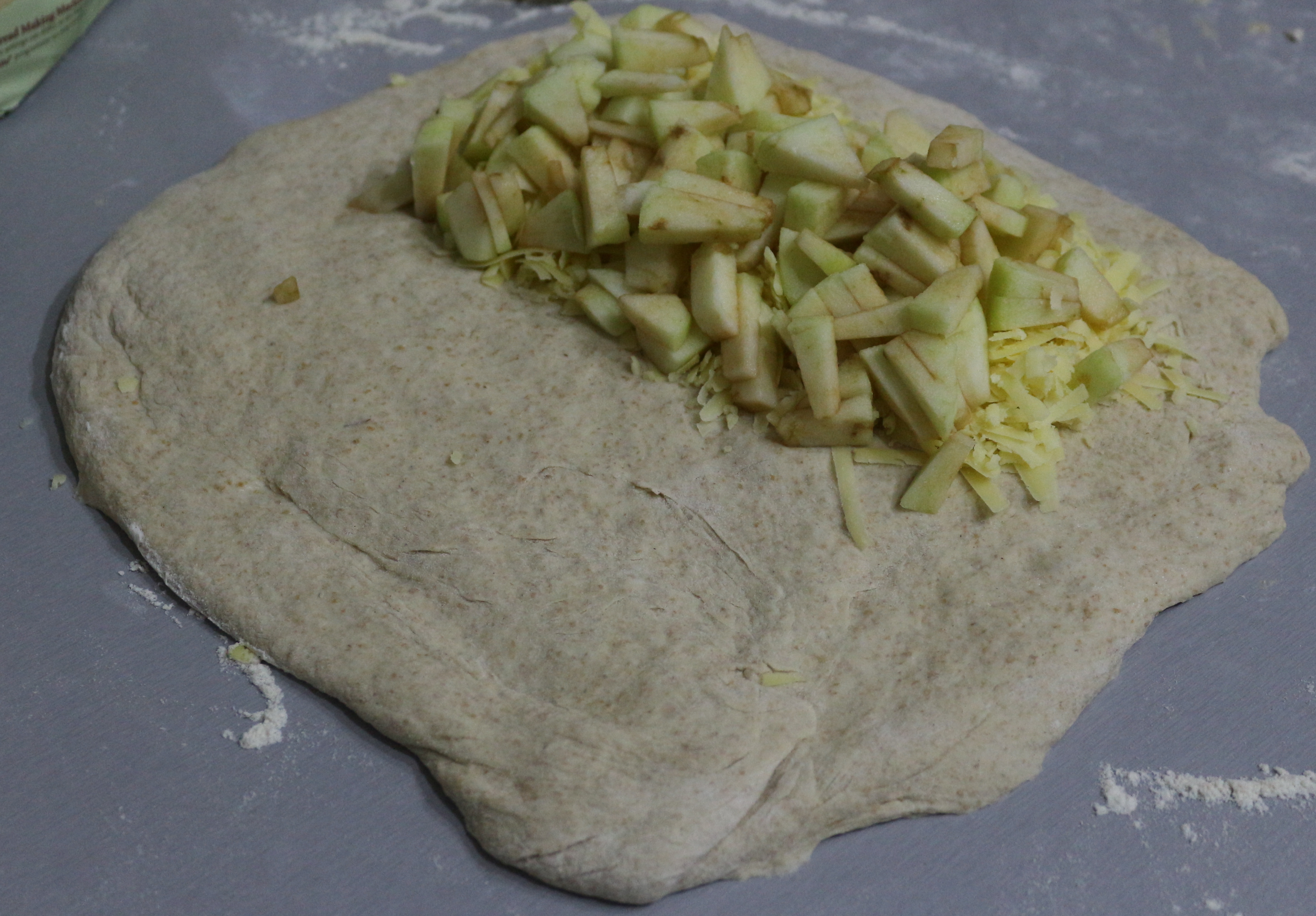 Sprinkle half the grated cheese over one side of the rectangle, and top with half of the apples, leaving a 1cm clear margin along the edges. note: one loaf had this, on the other, I added the cheese just the same, but applied a light layer of pickle to the other half.