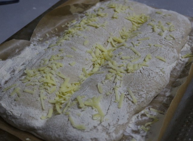 Sprinkle some more grated cheese over the surface of the loaves, and make an indentation along each loaf.