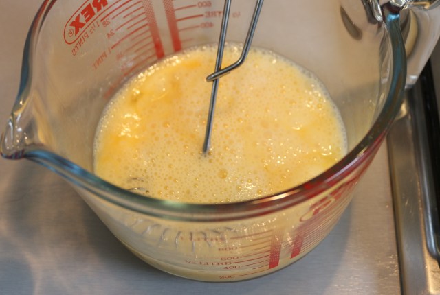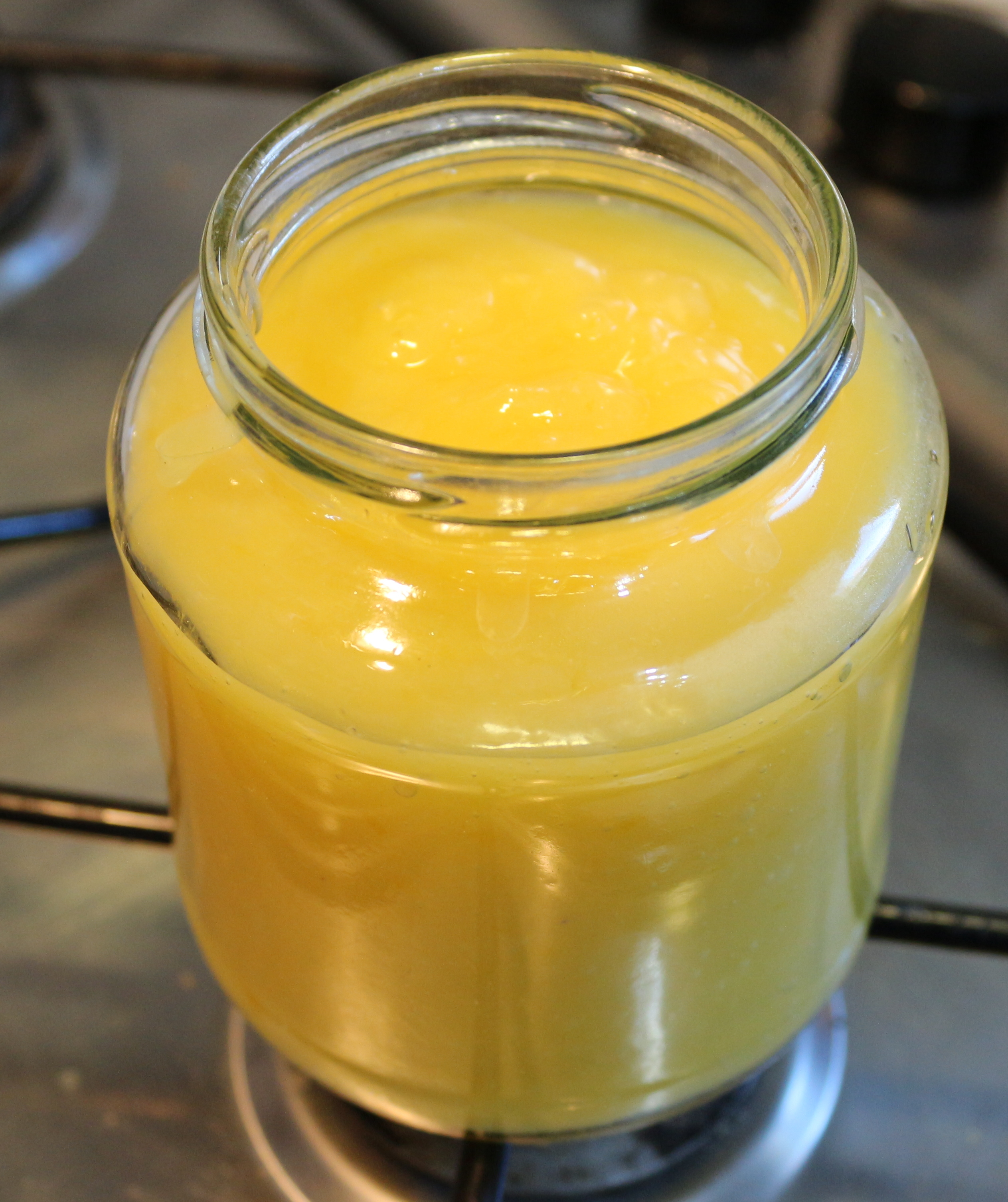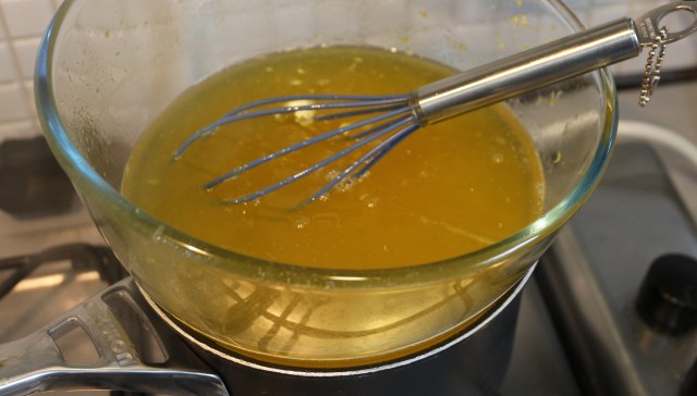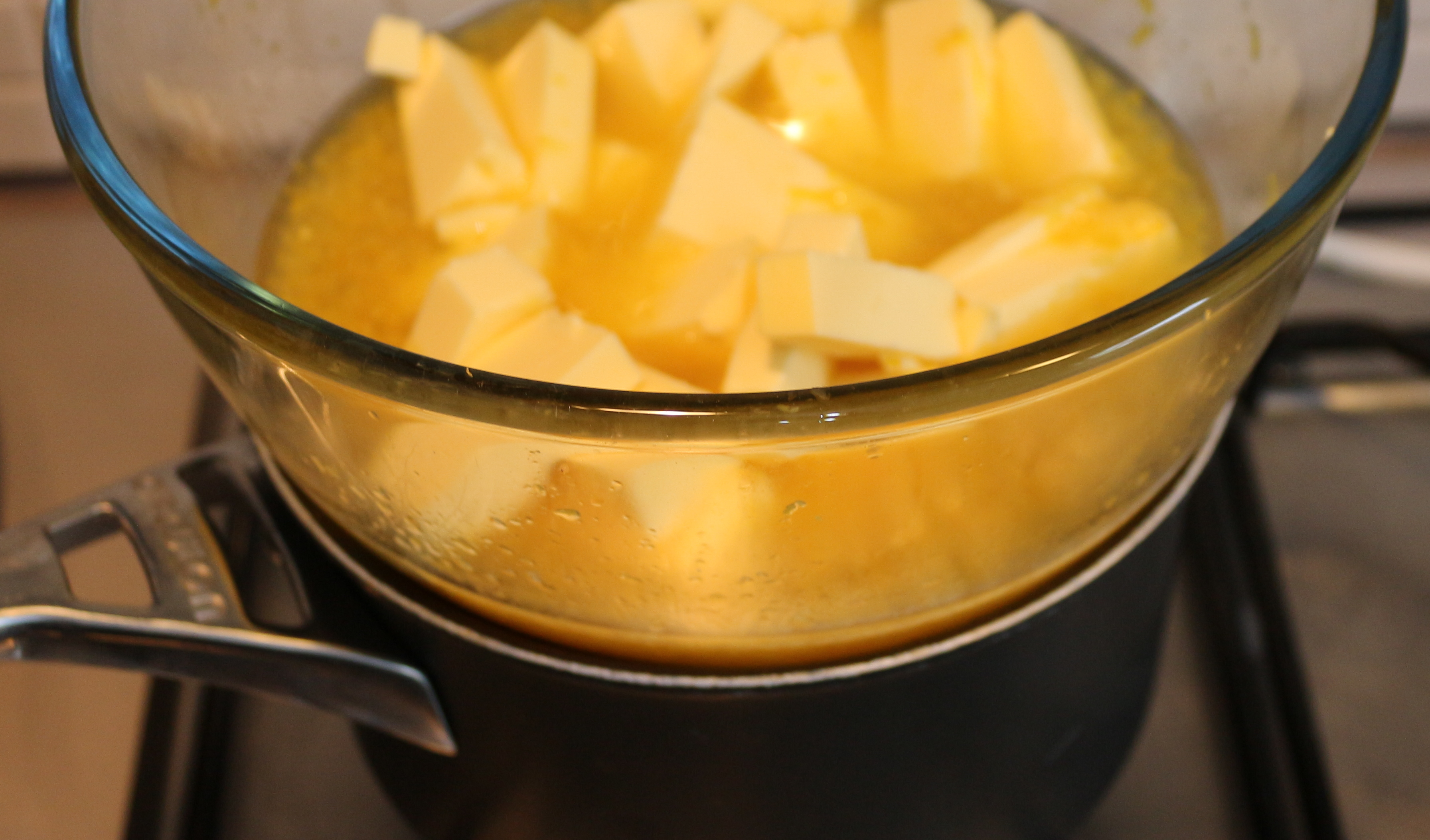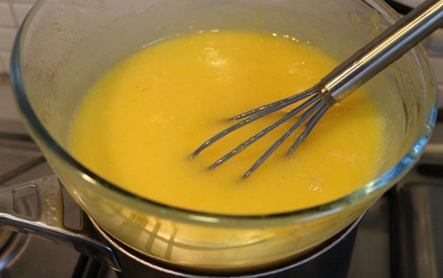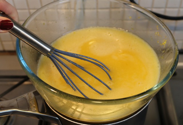 Take a cupful of the lemon/butter/sugar mixture and add to the eggs to bring them to temperature, then add the whole lot back into the bowl.