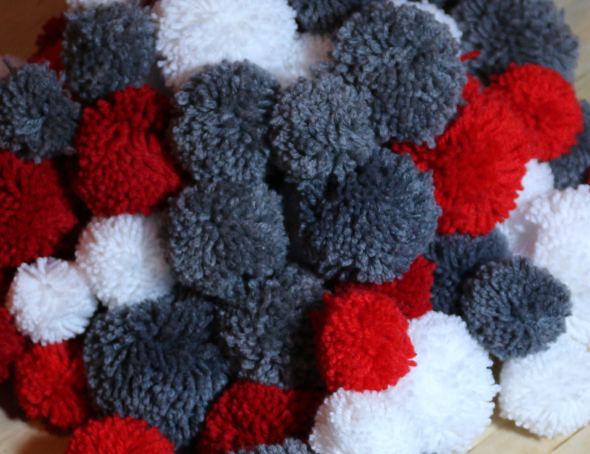…it was time to make my garland! Pom Poms in Red, Grey, and White, and in a few different sizes. I have planned for this to decorate the dining room, and have picked up some red and white cloth napkins, and a red tablecloth for reasonably cheap, which I plan to embellish a little too. (note: I haven’t actually been making these nonstop… it’s just I kept being distracted and busy so had yet to finish it! When Nicole of Diary of a Mad Crafter posted her pom pom garland made from pre-made pom poms…. I thought that it was high time that I actually got this finished!)