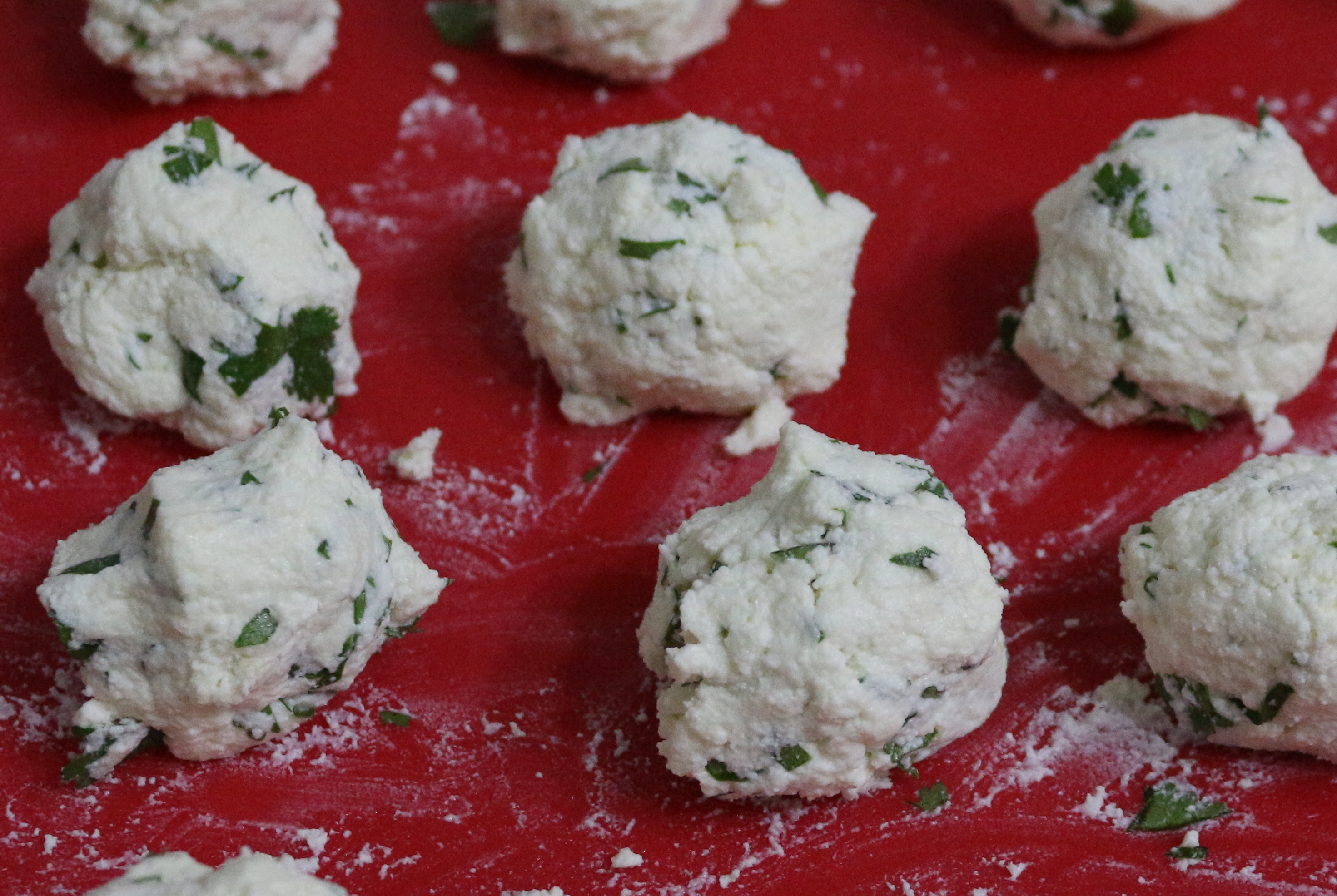 While the sauce is cooking, start to make the koftas. Break up and crumble the paneer until it is fine, then, with the palm of your hand, knead until it is even finer (when you squeeze it together it should hold it’s shape). The more it is worked, the finer  and smoother it becomes. Add 1/2tsp of salt and the coriander leaves and form into large marble sized balls: