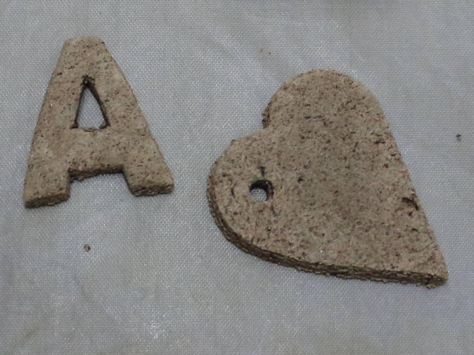 I made holes in the hearts and the cat (so that I could use them as tags) using a disposable drinking straw (cunning plan as it cuts them and collects them!), and cut the centres out of the A’s: