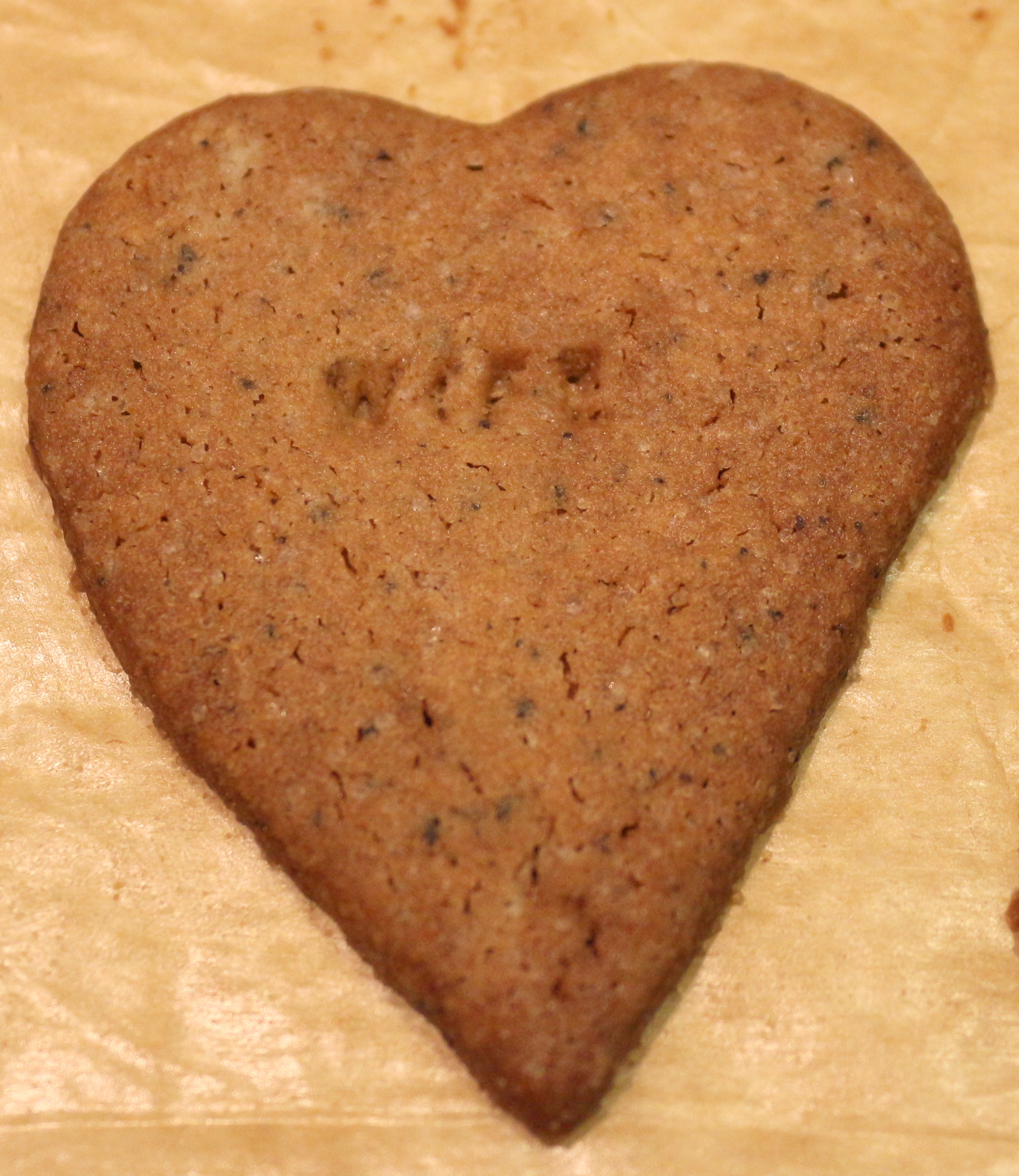 Last, but not least, I made some biscuits out of the dough from this recipe. My brother bought me this cutter for christmas that allows you to imprint little messages in things…. So I cut out some hearts and imprinted them with Wife. (I call him wife, he calls me wife….. and this in fact predates us even being married!)