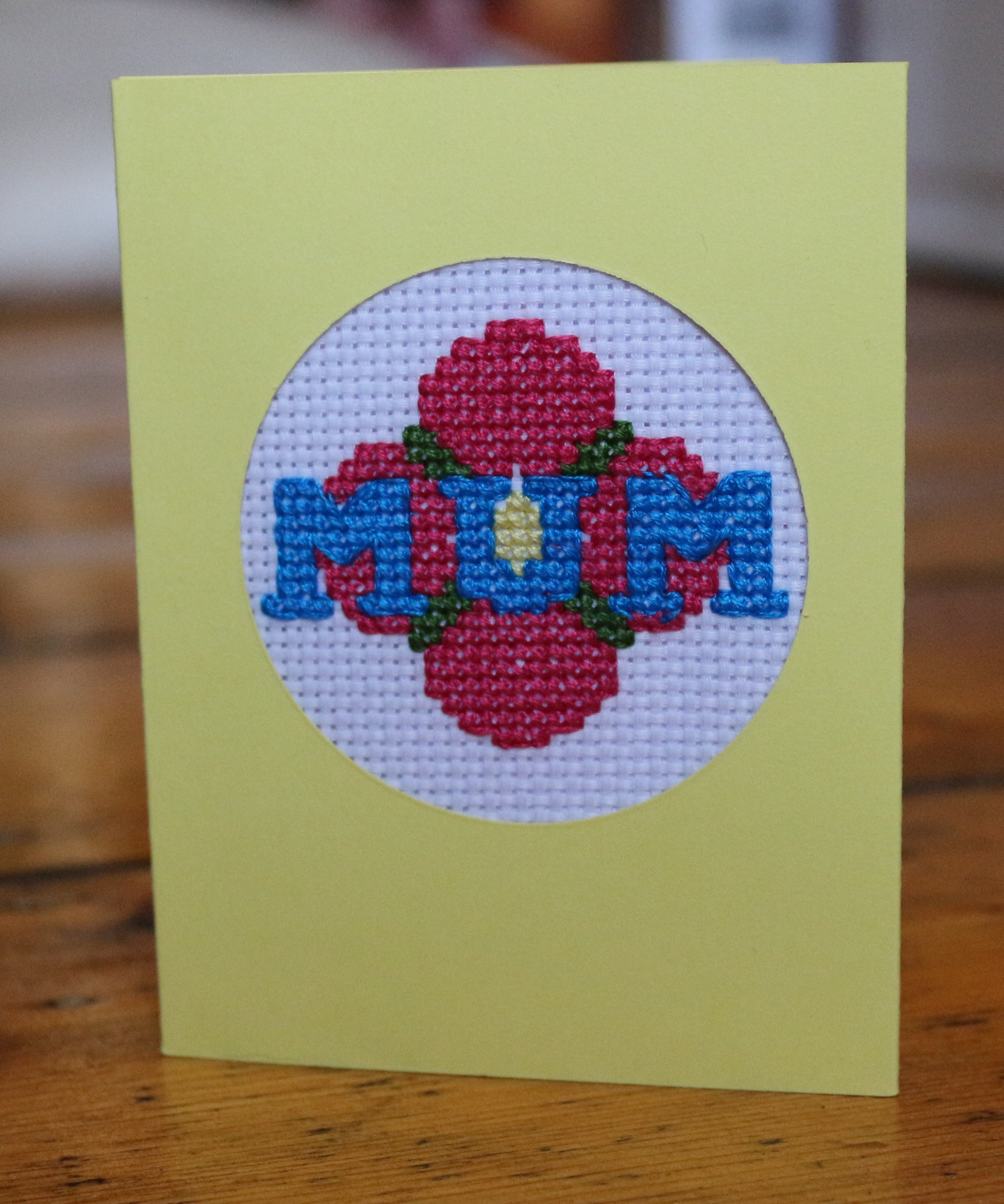 I decided to make our Mother’s day cards this year, starting off with just a simple stitched ‘Mum’, then embellishing with a little extra. For one, I took inspiration from an old blackwork pattern in an issue of CrossStitcher magazine: