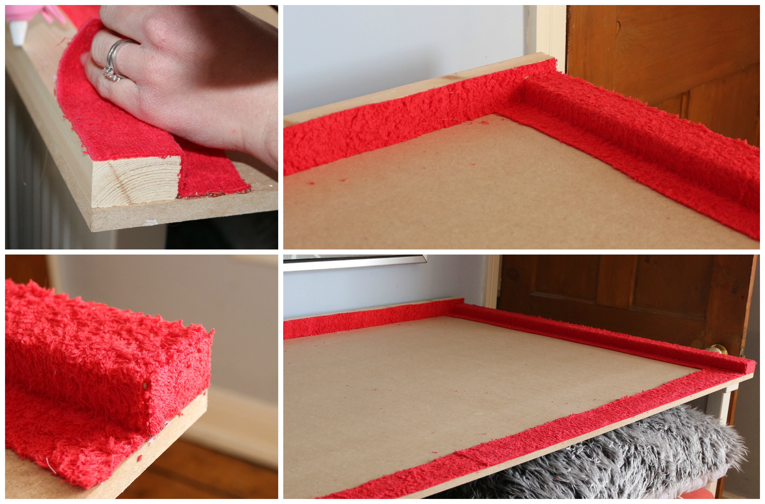 The surface would be supported at the back and sides by resting on the raised back and sides of the bed, but to support the front edge and prevent it from sagging in the middle, we attached a wooden baton across the front. We also then attached wooden batons to the sides to stop it slipping around.