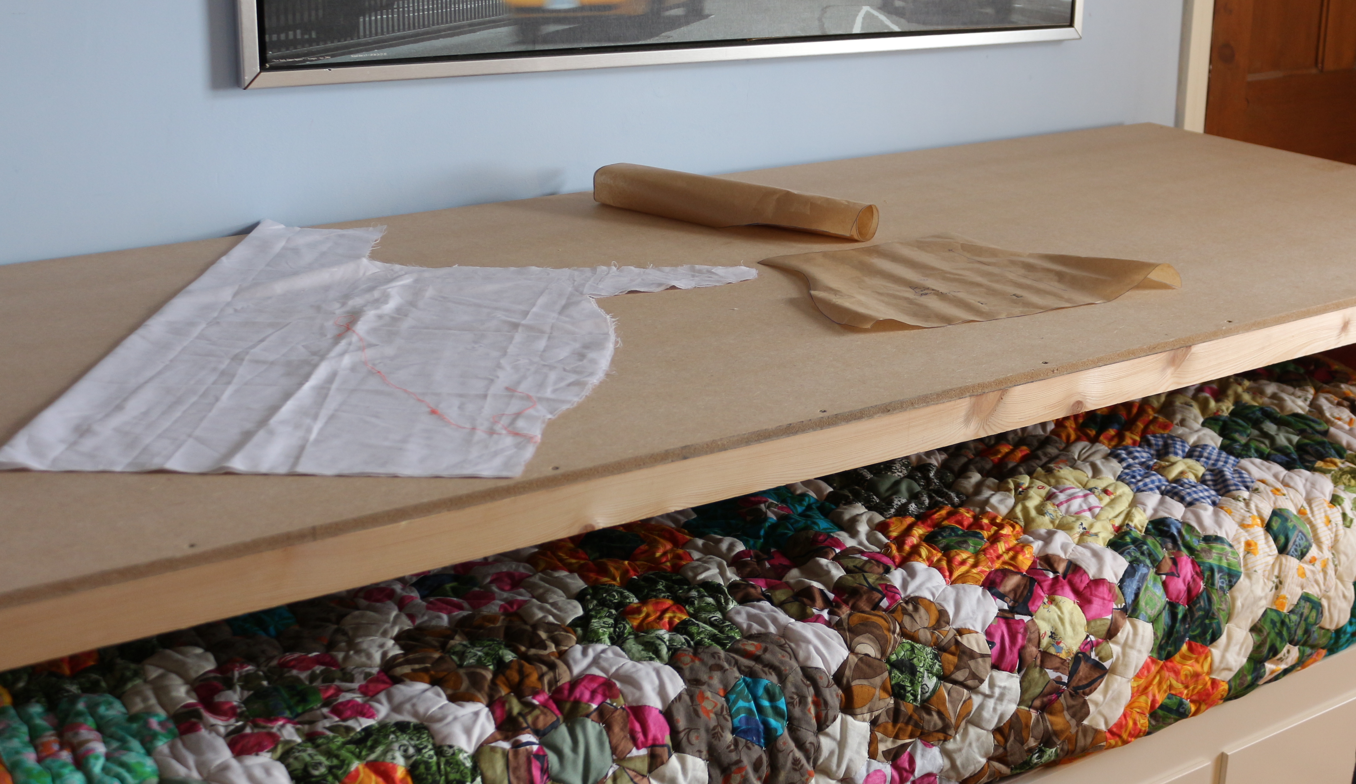 My only work surface in said crafting room however is a desk that usually has my sewing machine on it along with a little old 14″ CRT TV that I like to use to watch various random DVDs while crafting (period dramas being a favourite, although have been watching a bit of Kill Bill this week). It’s not a massive surface (even without the sewing machine), and the floor is very uneven, with gaps between the floorboards, so also not really lending itself to laying out and cutting patterns.