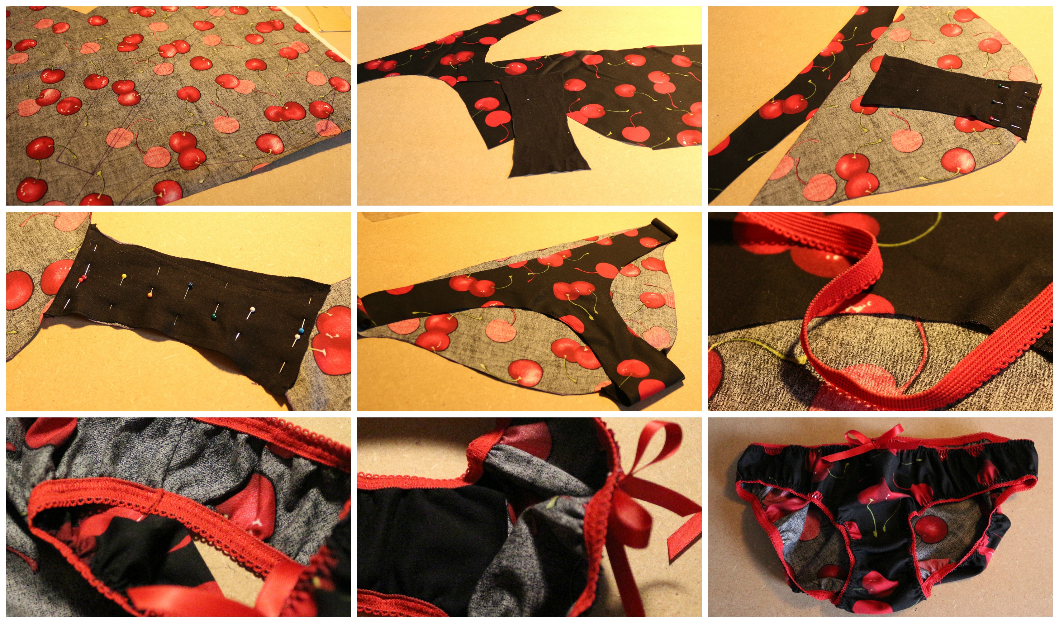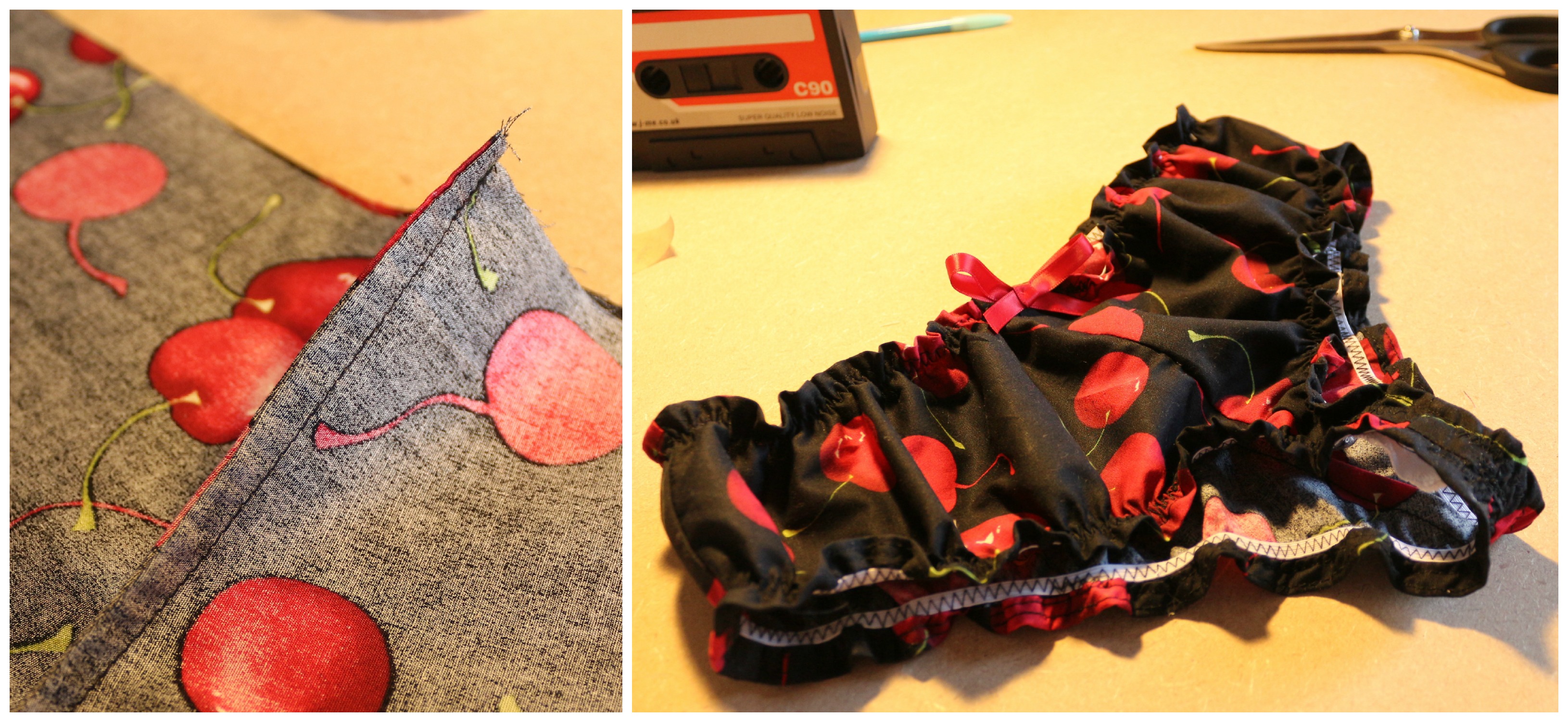 It’s a really simple pattern, one piece for the back, and one for the front out of cotton, and a piece cut from cotton jersey for the gusset. You layer up the pieces front, back, gusset, and sew together at the bottom. You then fold the gusset over and along the crotch edges, then sew the front to back together at the sides. Gathering along the waistline and leg holes is done using knicker elastic, which can be difficult to get hold of, but is really easy. Then a little bit of ribbon for a bow and done!