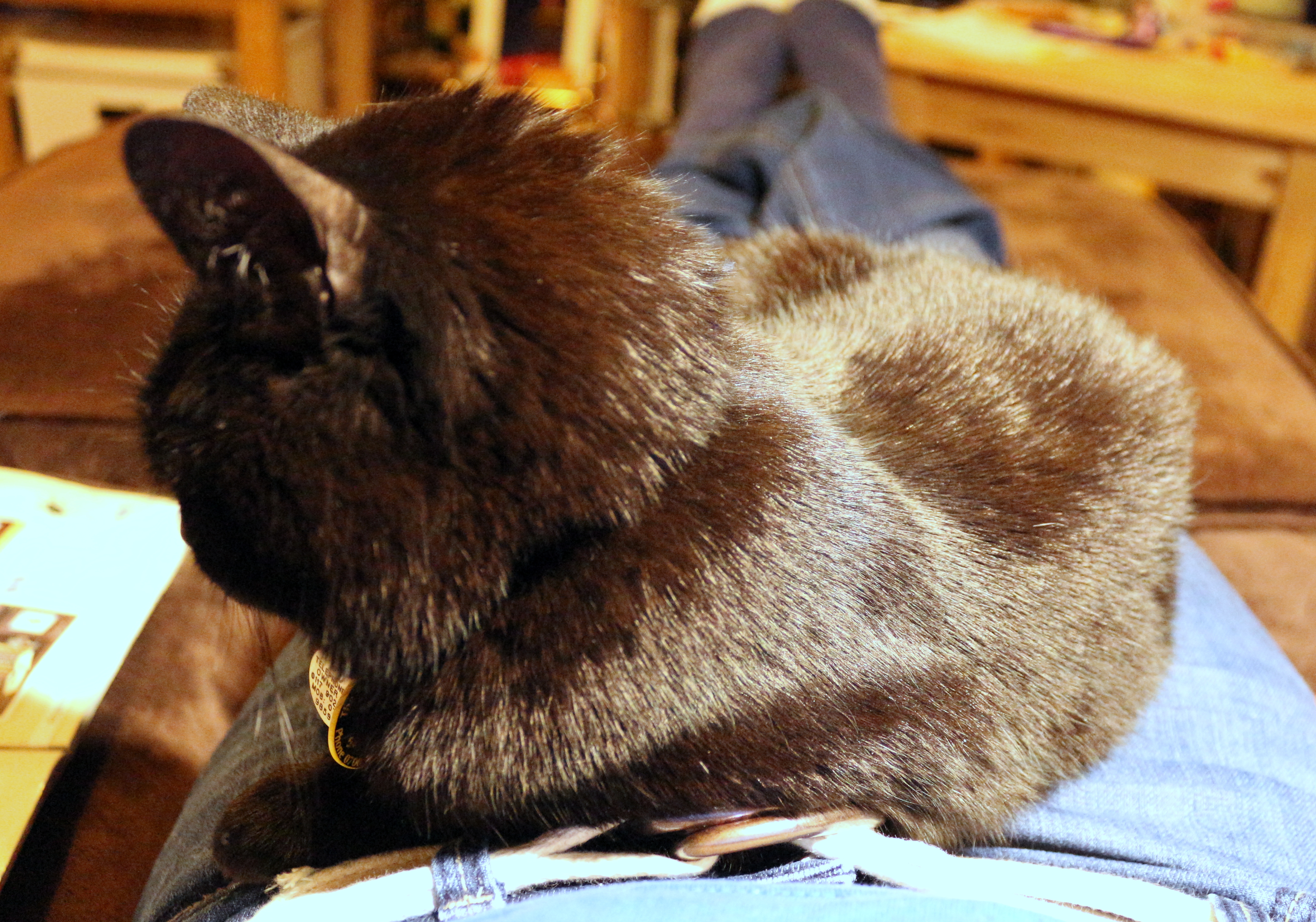 A person may take this for affection. I however know that it is due to her love of thread. She will often take a sudden swipe at my thread as I am stitching, or try to eat it, rendering it wet and icky. Thanks love. Silly puss.
