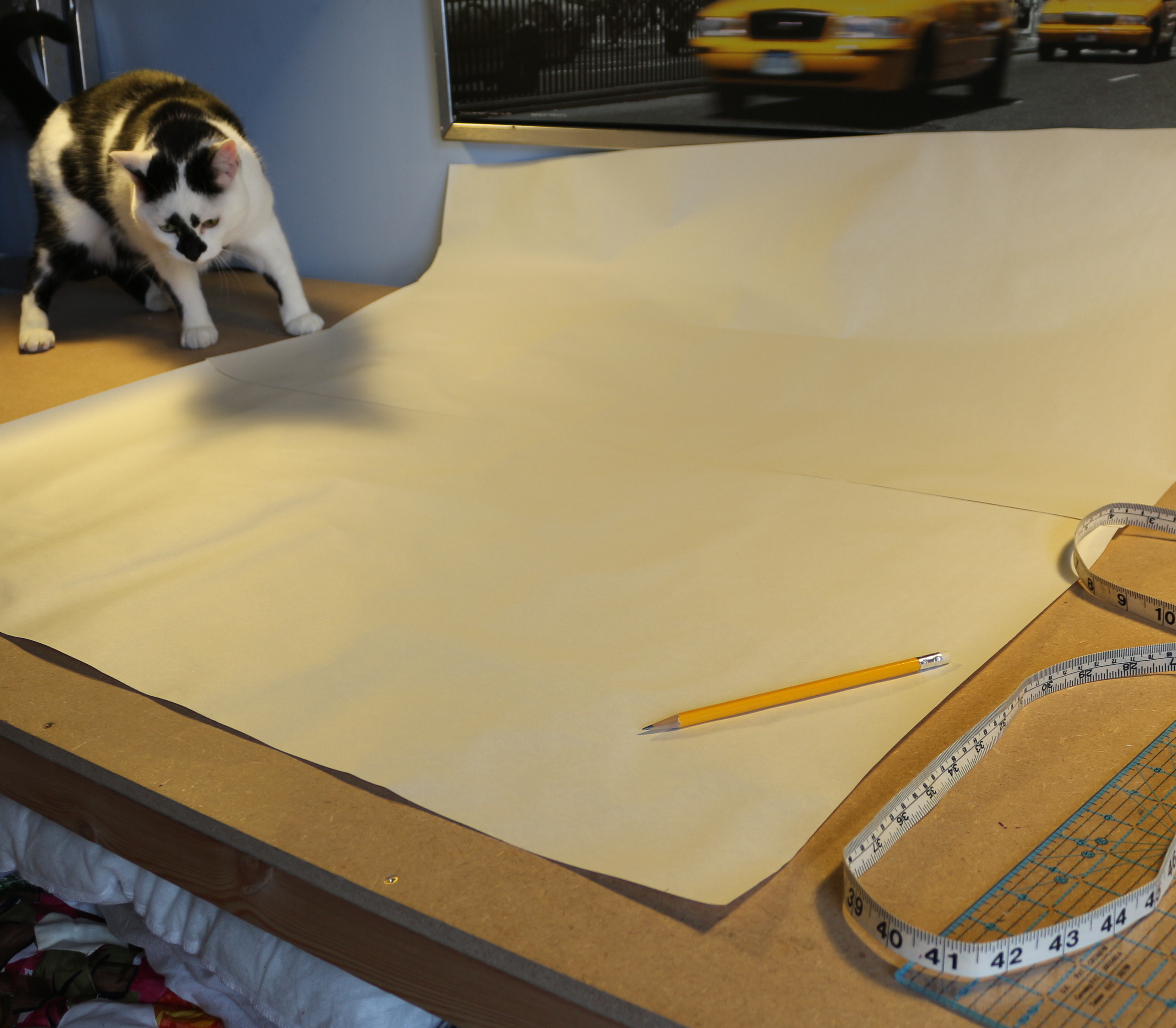 Anyhow, you had to cut five pole covers, four triangular side panels, and a top piece and two door pieces for the front. I drew out templates on paper first, cut the honeycomb fabric, then pinned these to my main fabric to cut each piece.