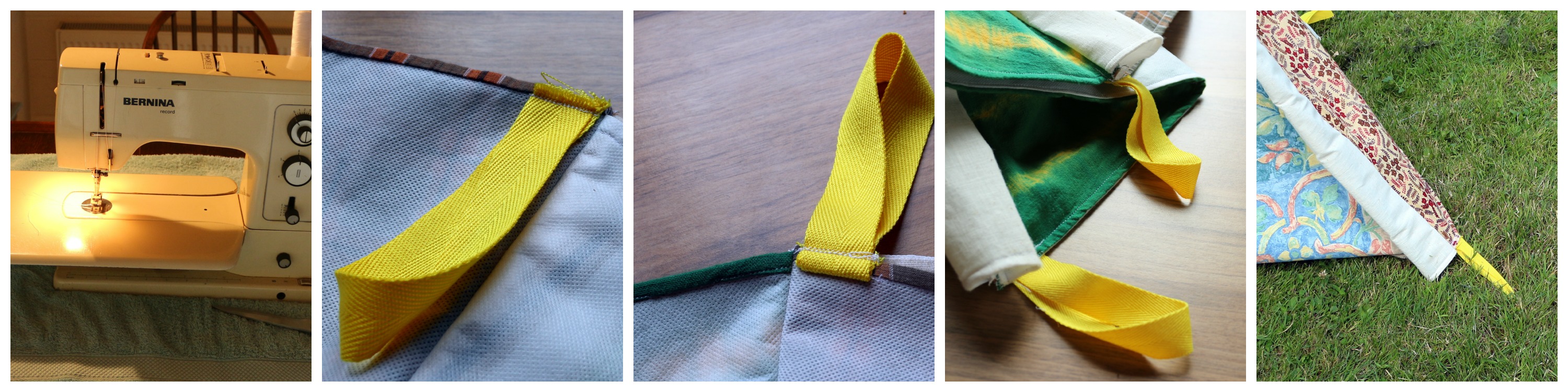 Thankfully my trusty Bernie (Bernina) was on hand, along with some more twill tape, and I constructed some loops to attach to the base at each corner, so that it could be pegged down.