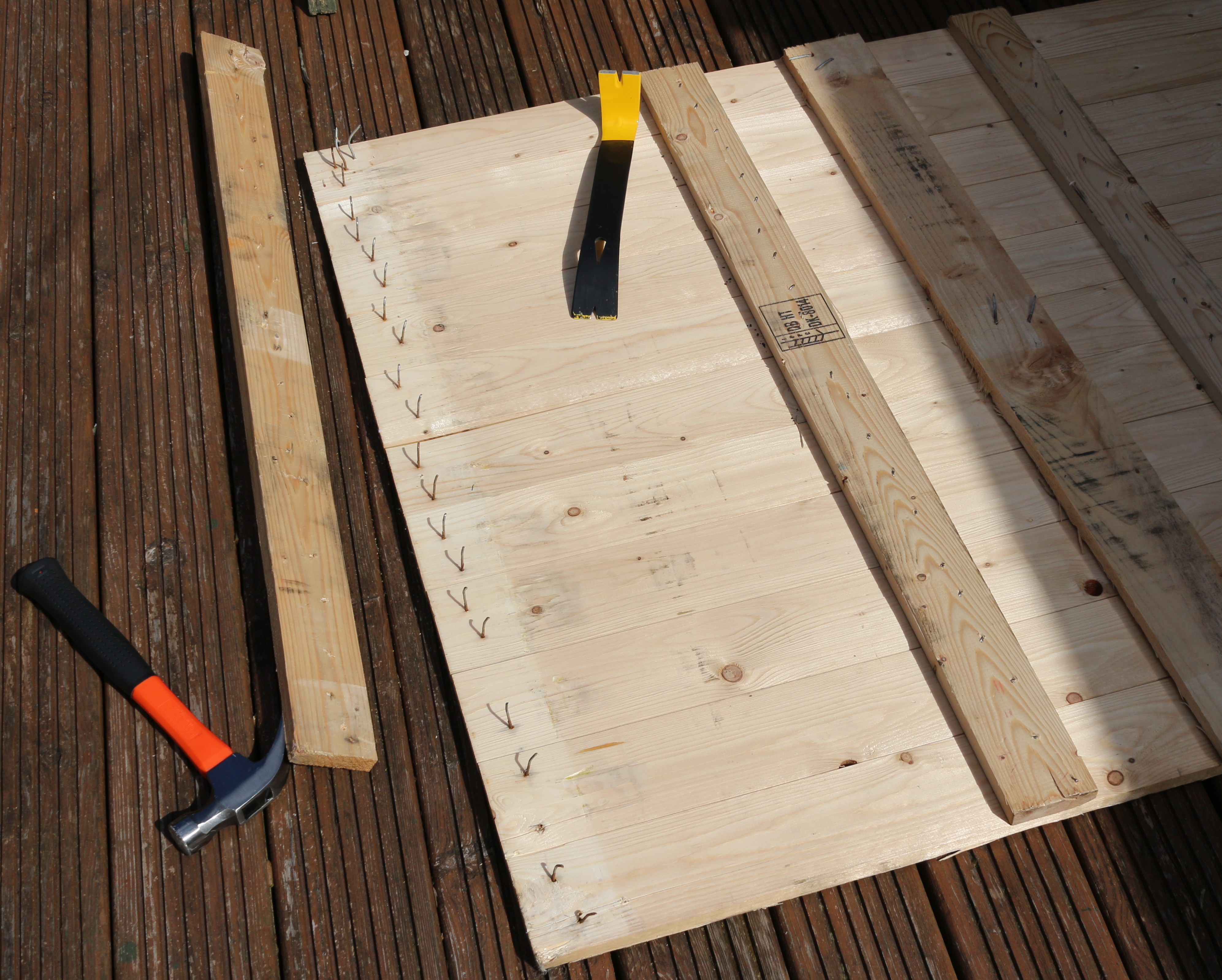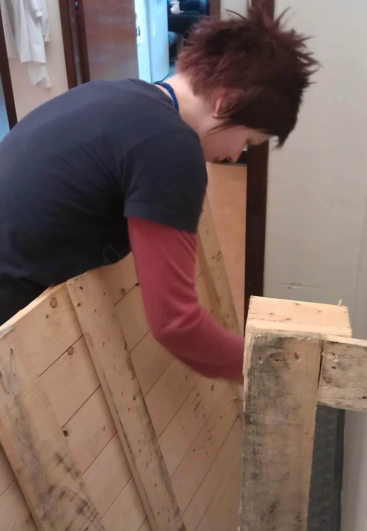 The first part, dismantling the pallet, took place at work. I felt very suspicious indeed wandering around with a crowbar and a claw hammer in my backpack…. but my friend Kat and I managed to pry the top part from the base without too much trouble: