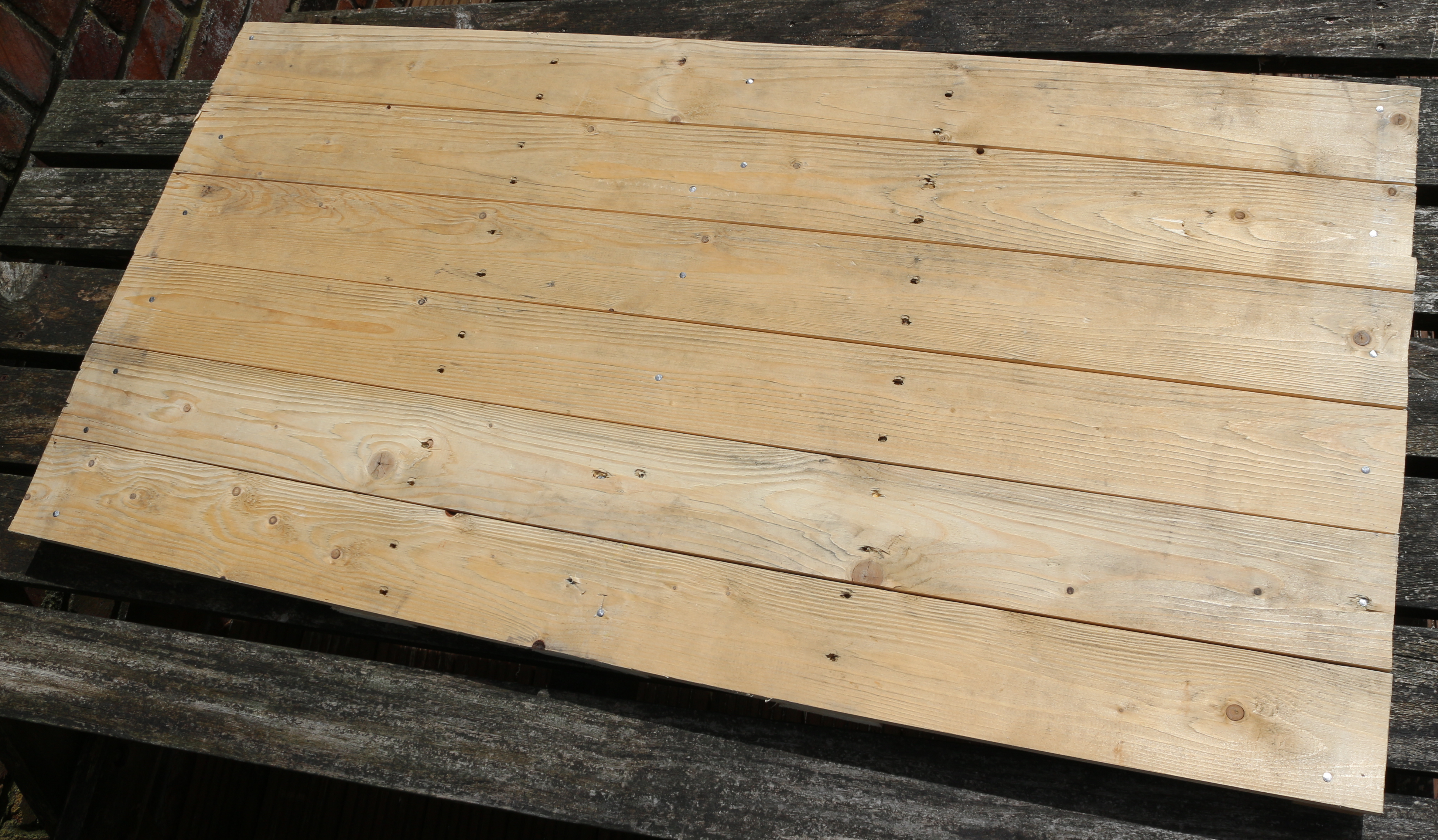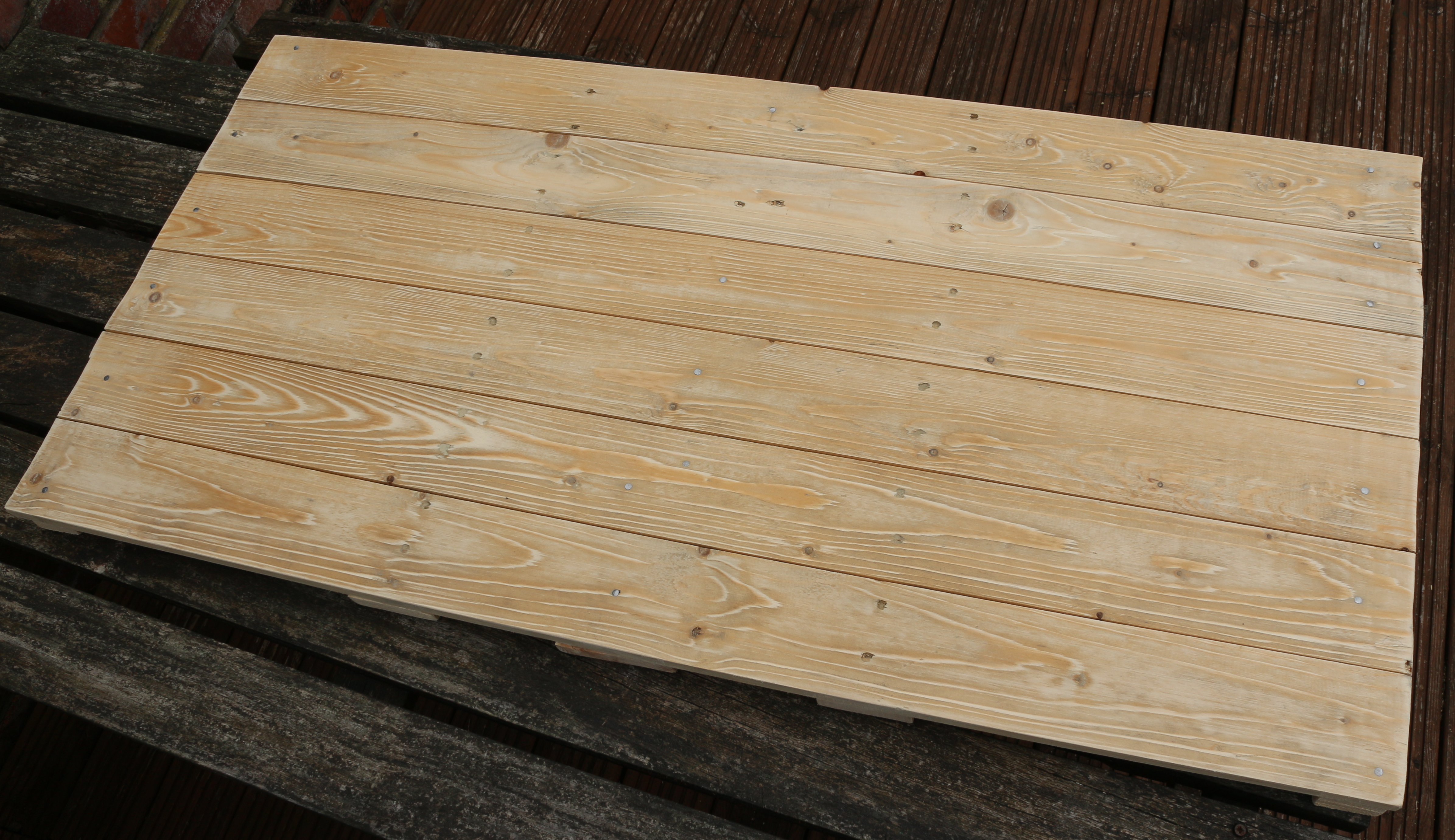 Each piece of wood across the top was  9x100cm, and there were 10 pieces. The edges of the pallet were a bit damaged, so I decided to trim a little bit off each side, and remove some of the pieces.
