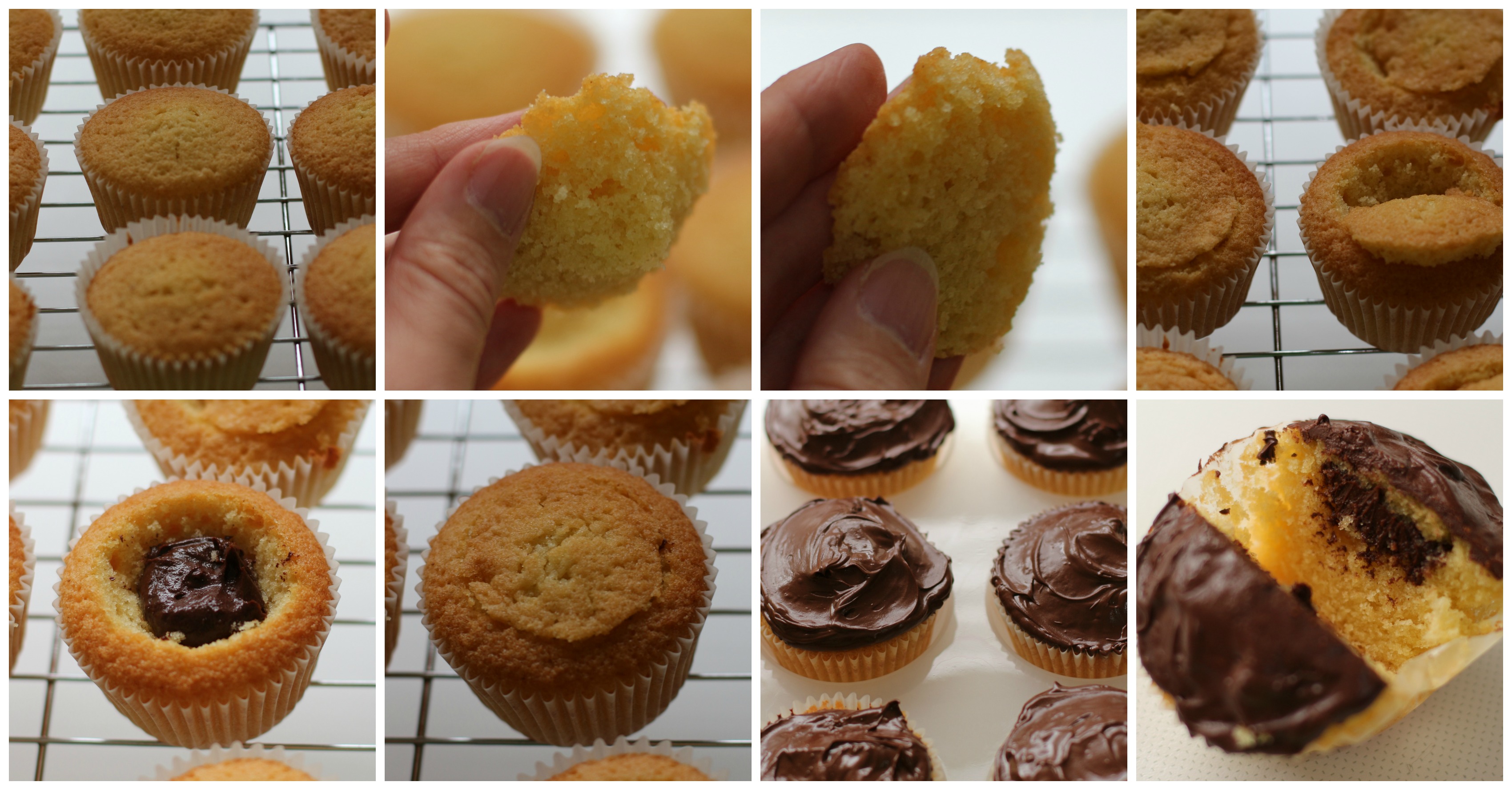Cut cones out of the cooled cakes, by angling a sharp knife down towards the centre of the cakes. Cut the bottom of the cone (and eat!), then replace on top of the cake. Fill the space made by the absence of the cake with ganache, then press down the top of the cake. Next, melt the chocolate, and cover the tops of the cakes!