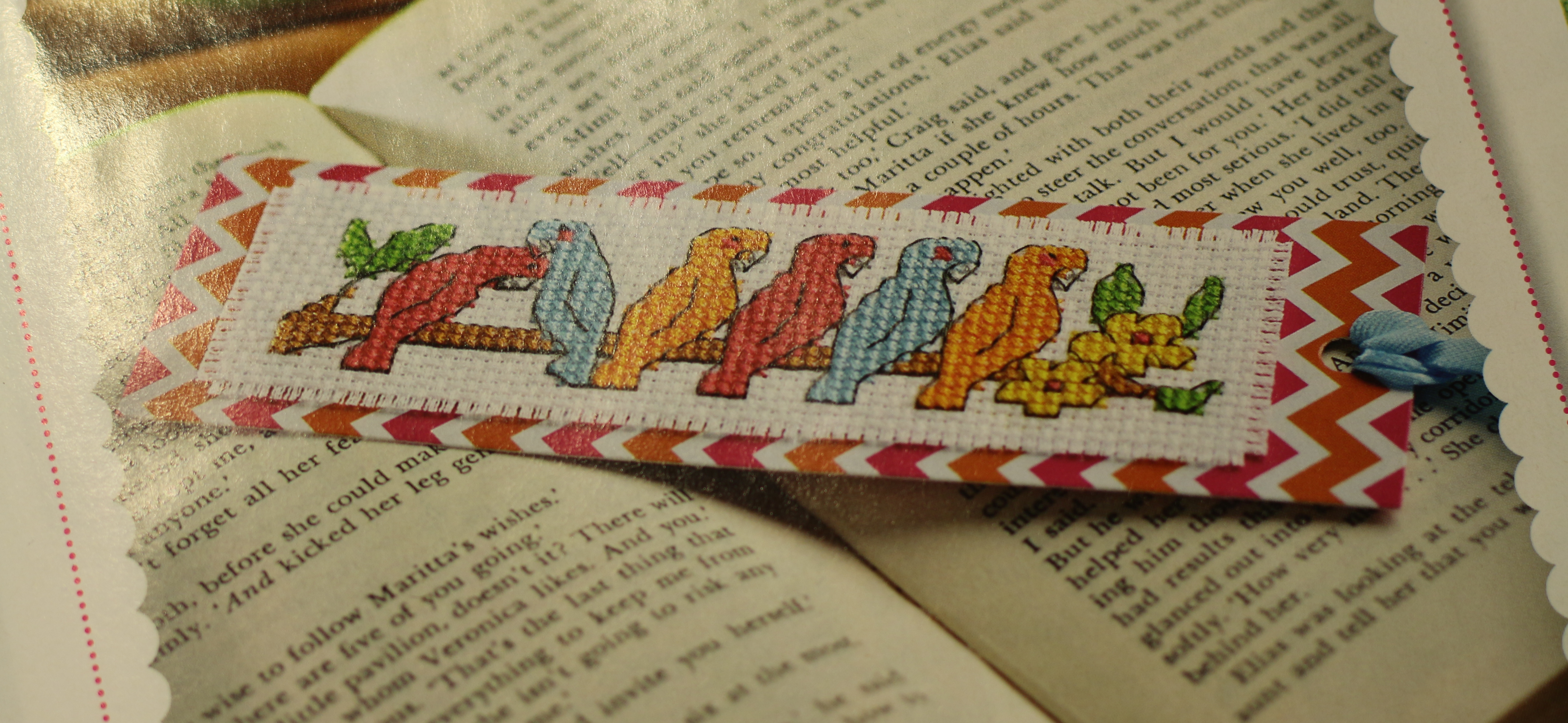 Yep. I forgot one of the parrots. I began with the central pink parrot, then did the brown of the branch all the way across, then the flowers and leaves, then went back to fill in the other parrots…. and realised I had missed out one. Ooops. Rather than unpick all the flowers etc… I figured it would look just fine with five, but re-jigged the colours. It’s fine. No biggie. I meant to do it…….