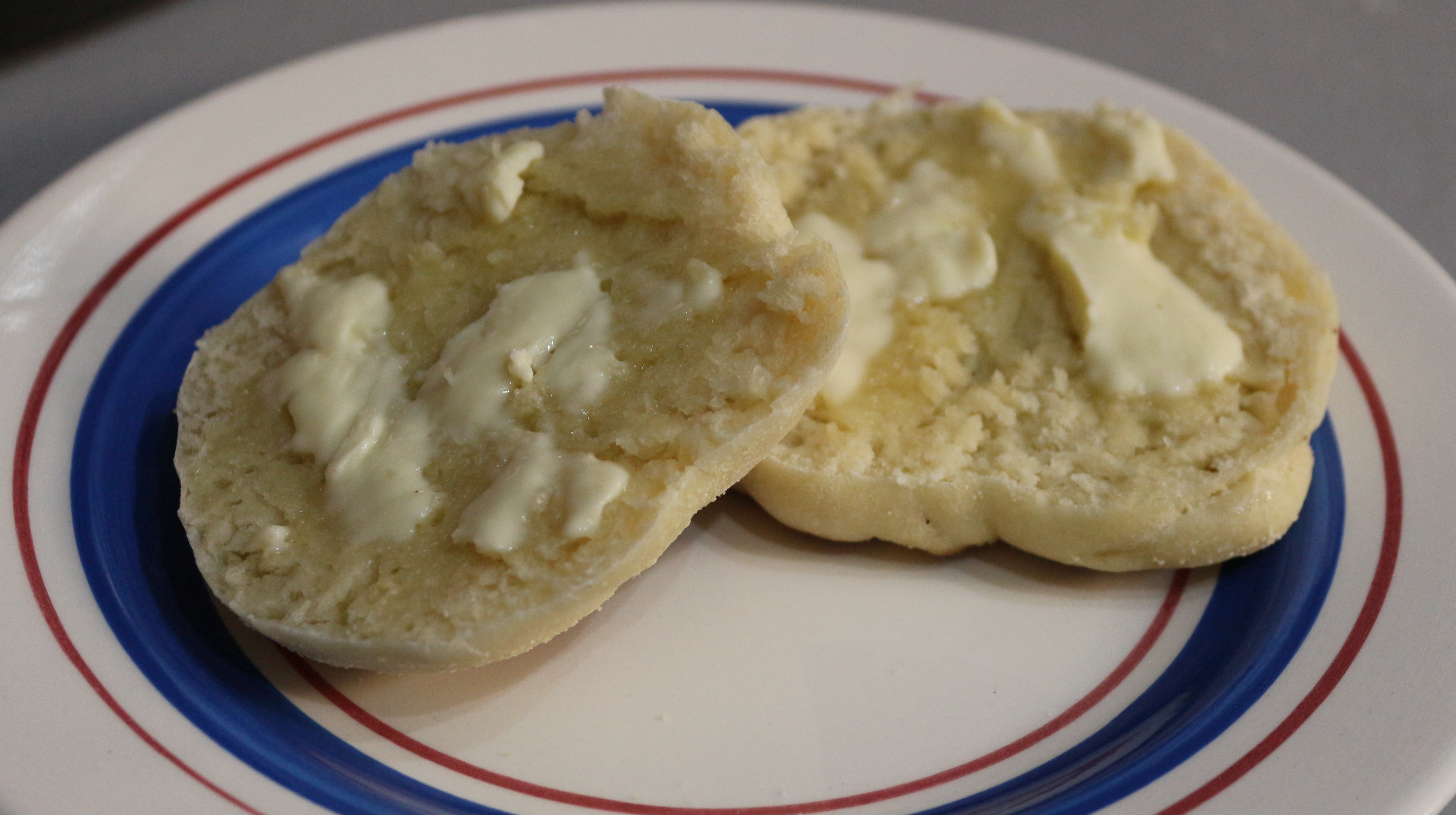 But the taste? Well, I cut one up and spread it warm from the griddle with a bit of butter:
