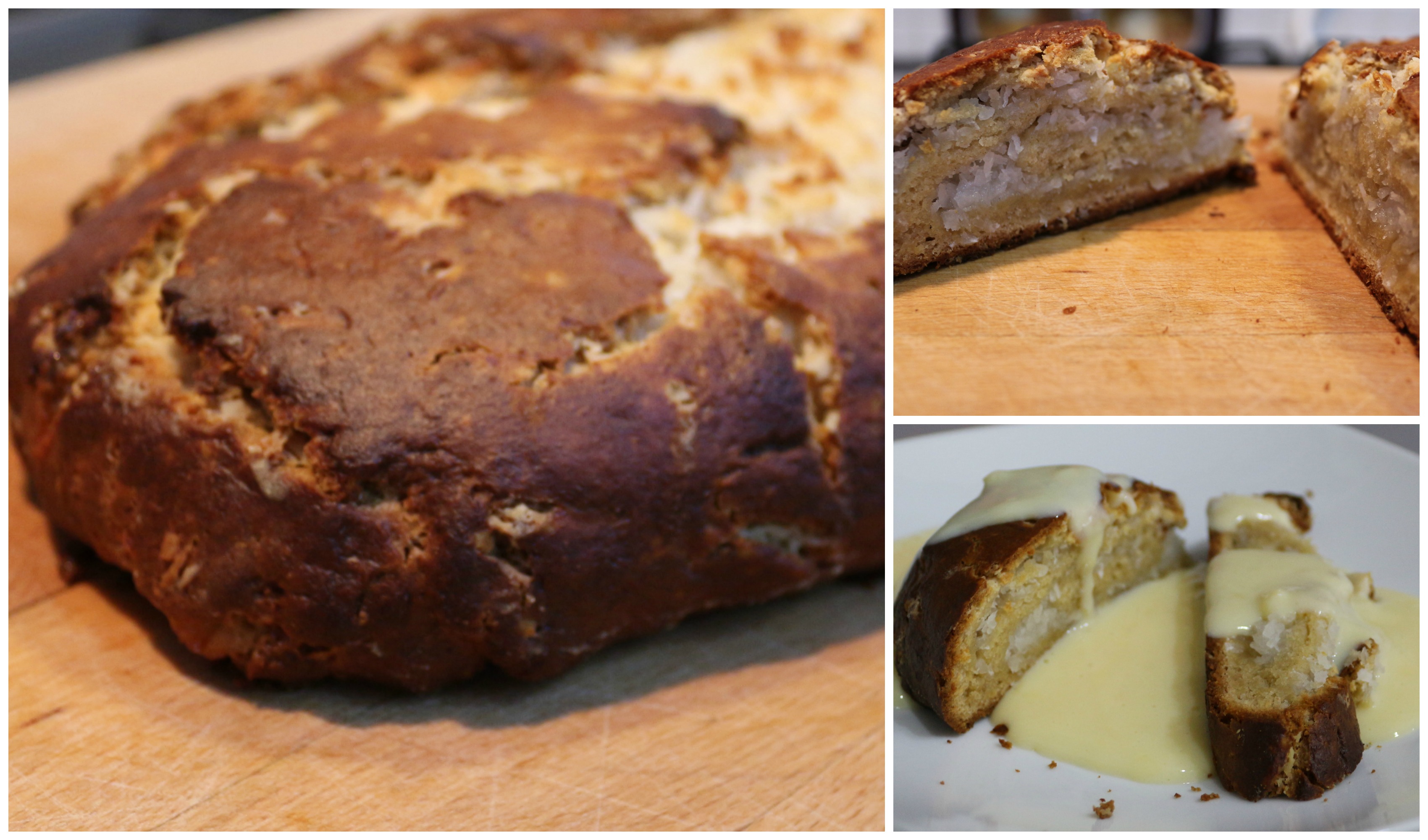 Yum! Is it wrong that this was my lunch? Followed by some jelly. I am using up the cupboards after all. It tastes like a dessert version of a Peshwari naan. I had some coconut stuff leftover, so added some cocoa powder to make it into a stiff dough, which I formed into a log, chilled, then sliced up into coconutty, chocolatey truffle-like slices. Yum. I’ll make those again for sure!