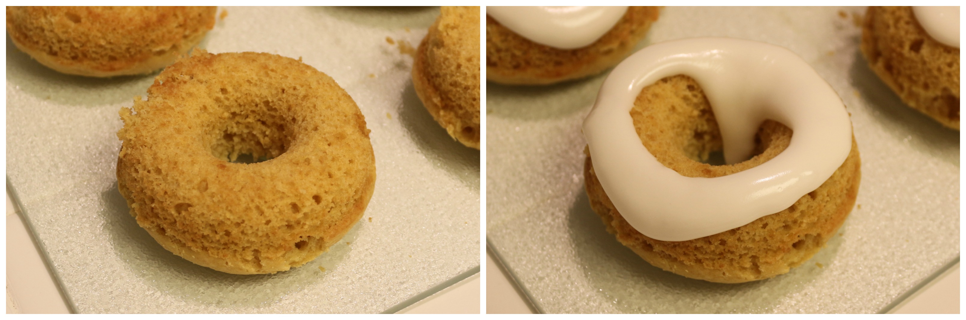 Using the remaining lemon juice, add enough icing sugar to make a pipable consistency, then pipe a ring of icing around the tops of the doughnuts!