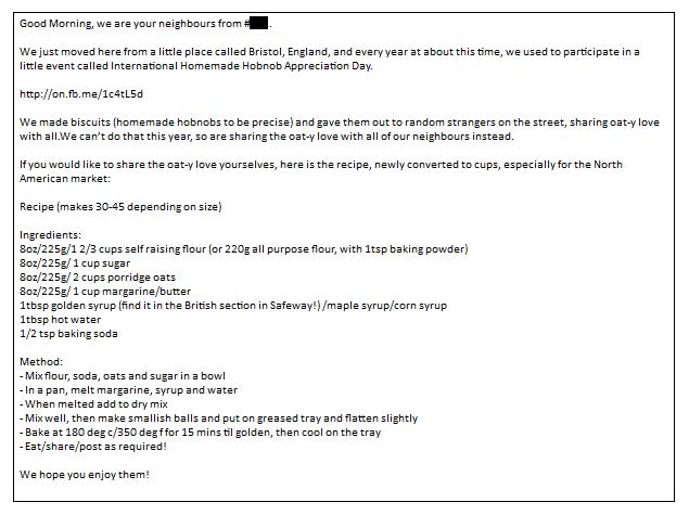 I also included a little note, so that they:,a) were less suspicious, and b) were then able to share the hobnob love with others. Like so: