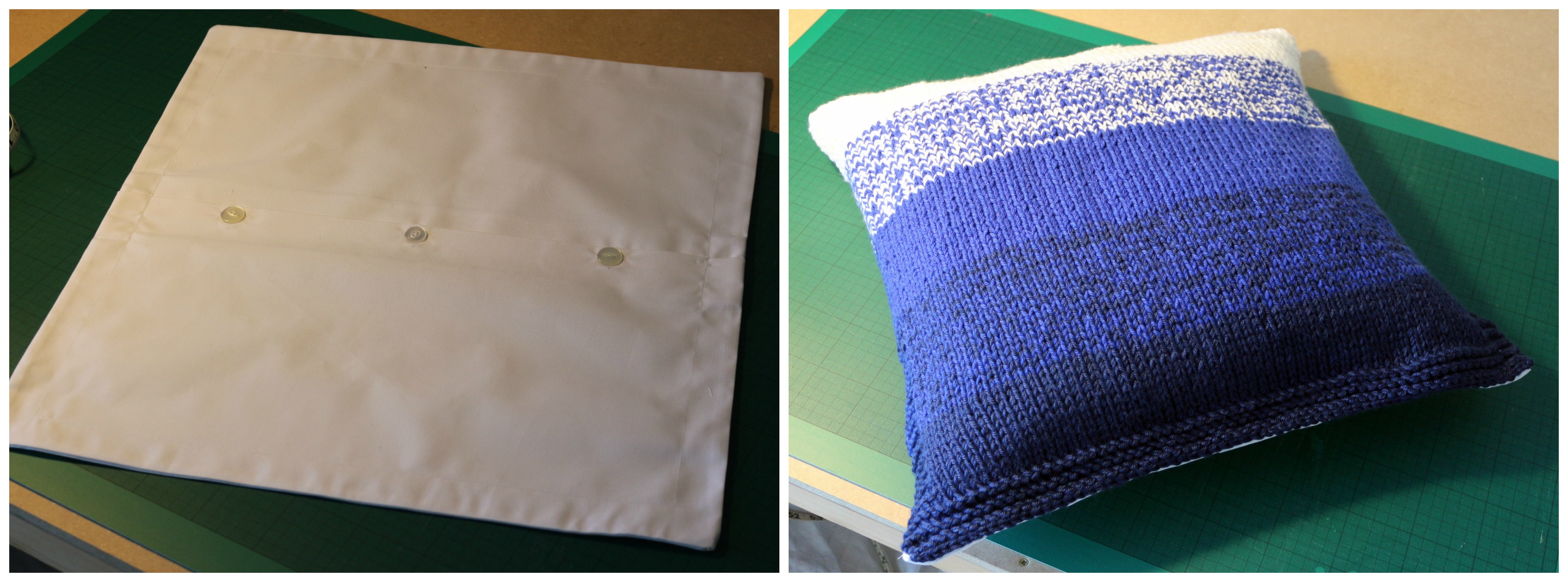 Weave in all your ends, then I ummed and ahhed a bit over the best way to do this next bit, I did try just sewing the knit piece straight on to some cotton, I wanted a fabric backing in order for it to maintain some structure to it, but the stitches were really visible. In the end, I made the base cover out of some regular cotton twill, with a buttoned closure at the back, then handstitched the knitted piece to the top, around the edges. (I may also add some stitches in the centre in order to keep it nicely in place, but haven’t decided yet.)