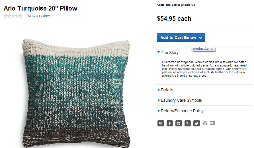 Anyhow, while we were at Crate and Barrel after Christmas, (spending our free gift card – we do shop other places honest) I saw this cushion: