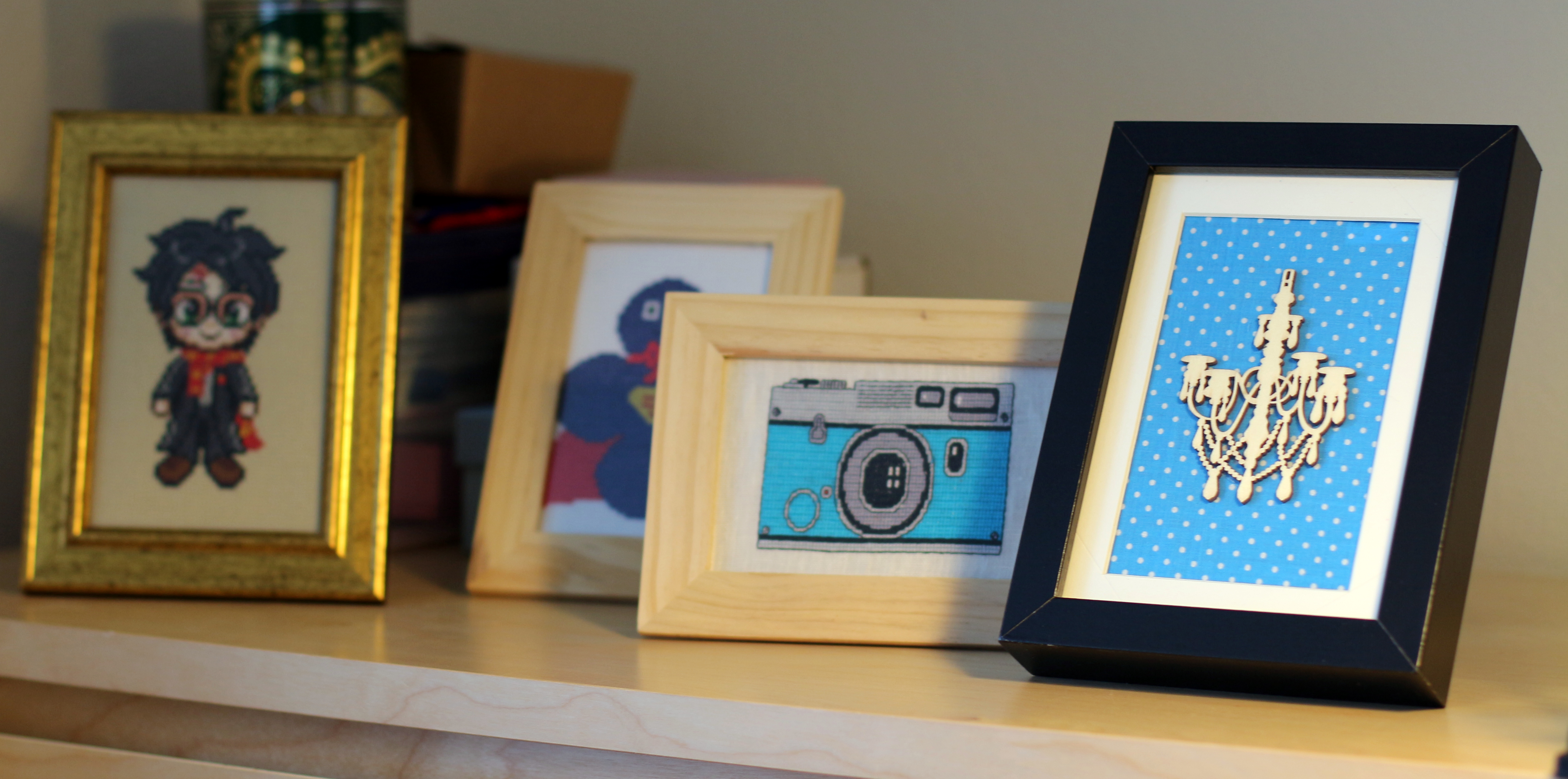I think it looks cute though, I have put it with my other little projects, mainly of the cross stitched variety (from L to R, Harry Potter, MRSA, Camera), up on the drawers in my crafting room: