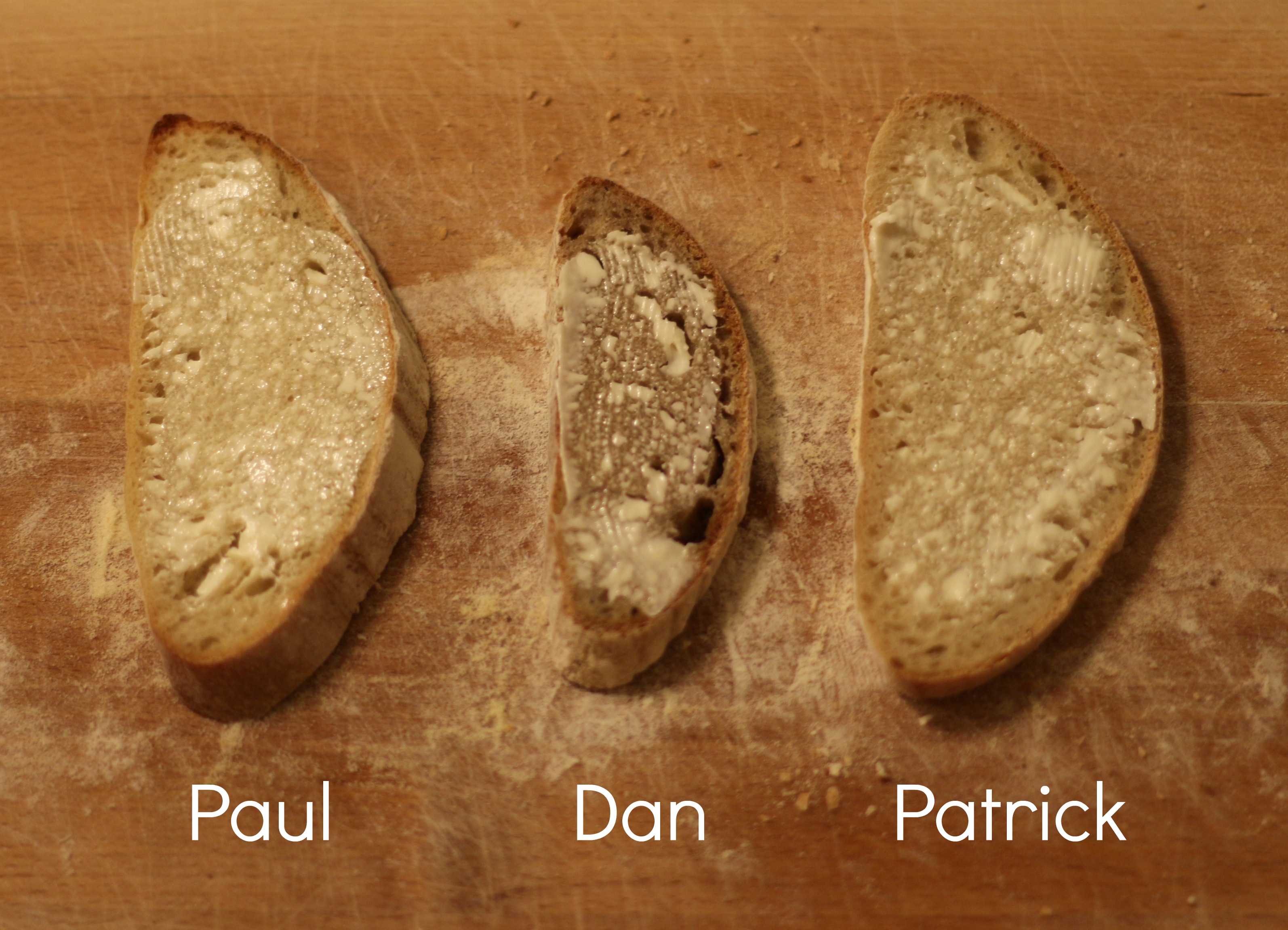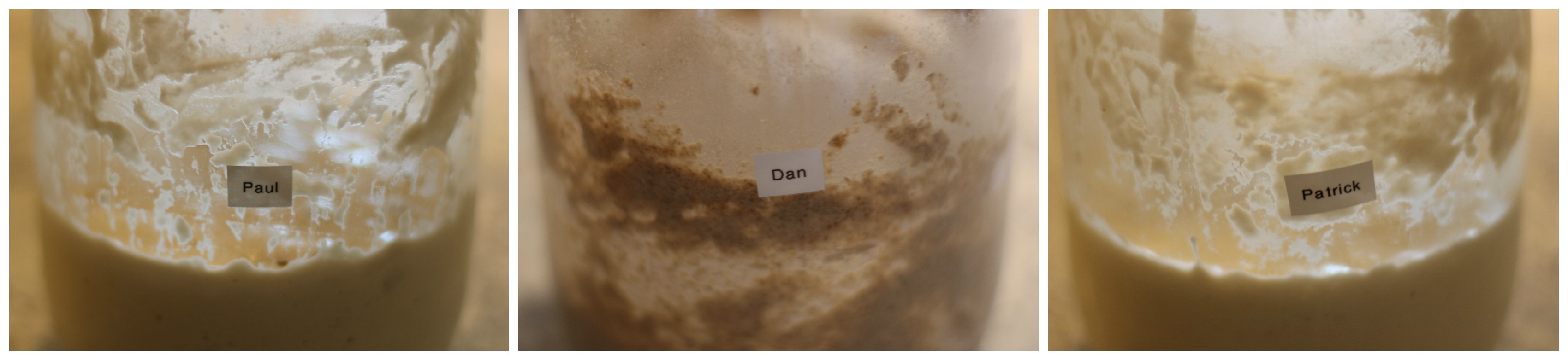 Patrick: I had to fight so hard against my inner microbiologist with this one. Leaving live yoghurt out for 24 hours? But of course this is the point. We want the organisms from the yoghurt to jump-start the starter, and give the bread a distinct sour tang. However, it is probably not advisable for pregnant women, or those more at risk of serious infections from milk products. Like with Paul, the flavour isn’t as strong as my previous one, or Dan, but the texture is really good.