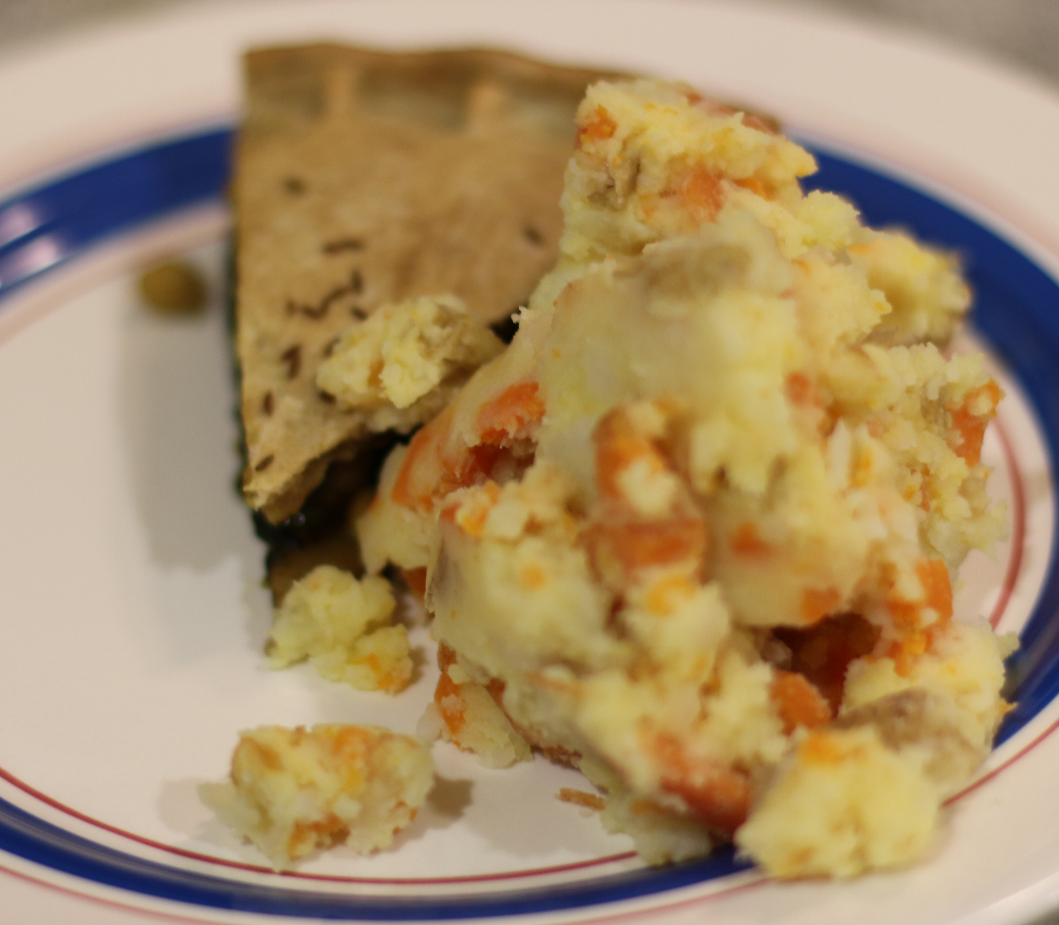 Then add the filling, and roll out the other piece of pastry to a circle to fit the top of the pie, lay it over the top, then crimp the edges. Brush with a little almond milk, then sprinkle with cumin seeds.