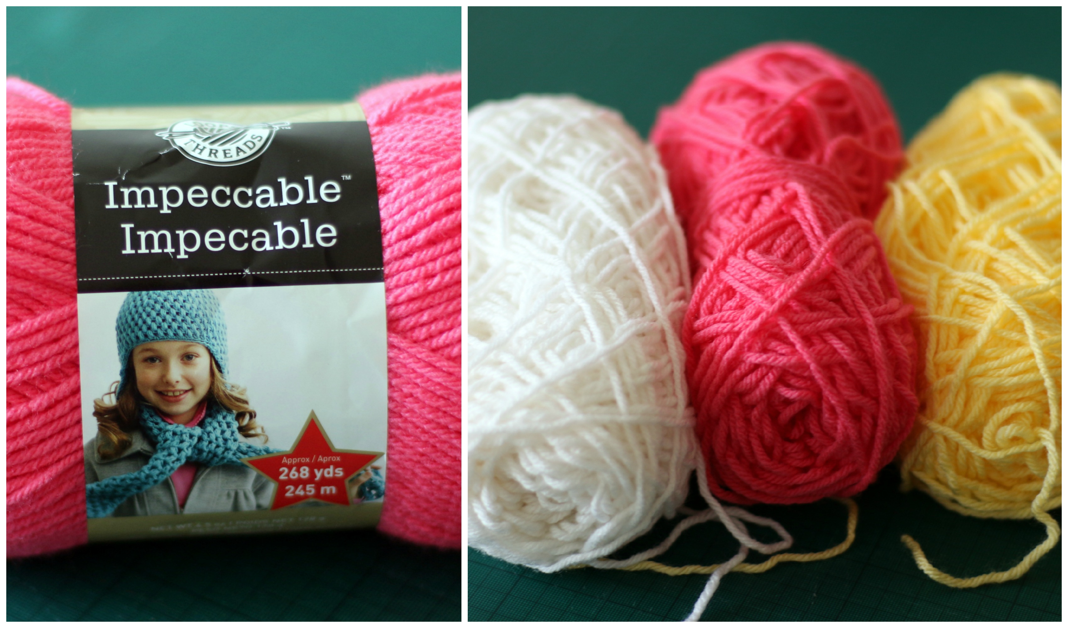 I ended up using 1 ball each of some yellow, white, and pink wool, although still had a whole lot leftover!