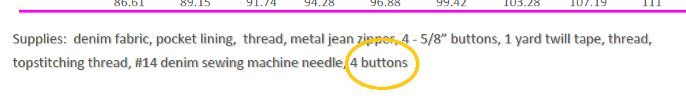 Another 4 buttons? – No, just the original 4 buttons repeated. Also the 1 yard of twill tape? What width? Luckily I had bought 2 spools of topstitching thread, as I would have run out otherwise, so it would have been helpful to have an approximation of how much thread was going to be required for topstitching. Running out mid-project would have been really annoying!