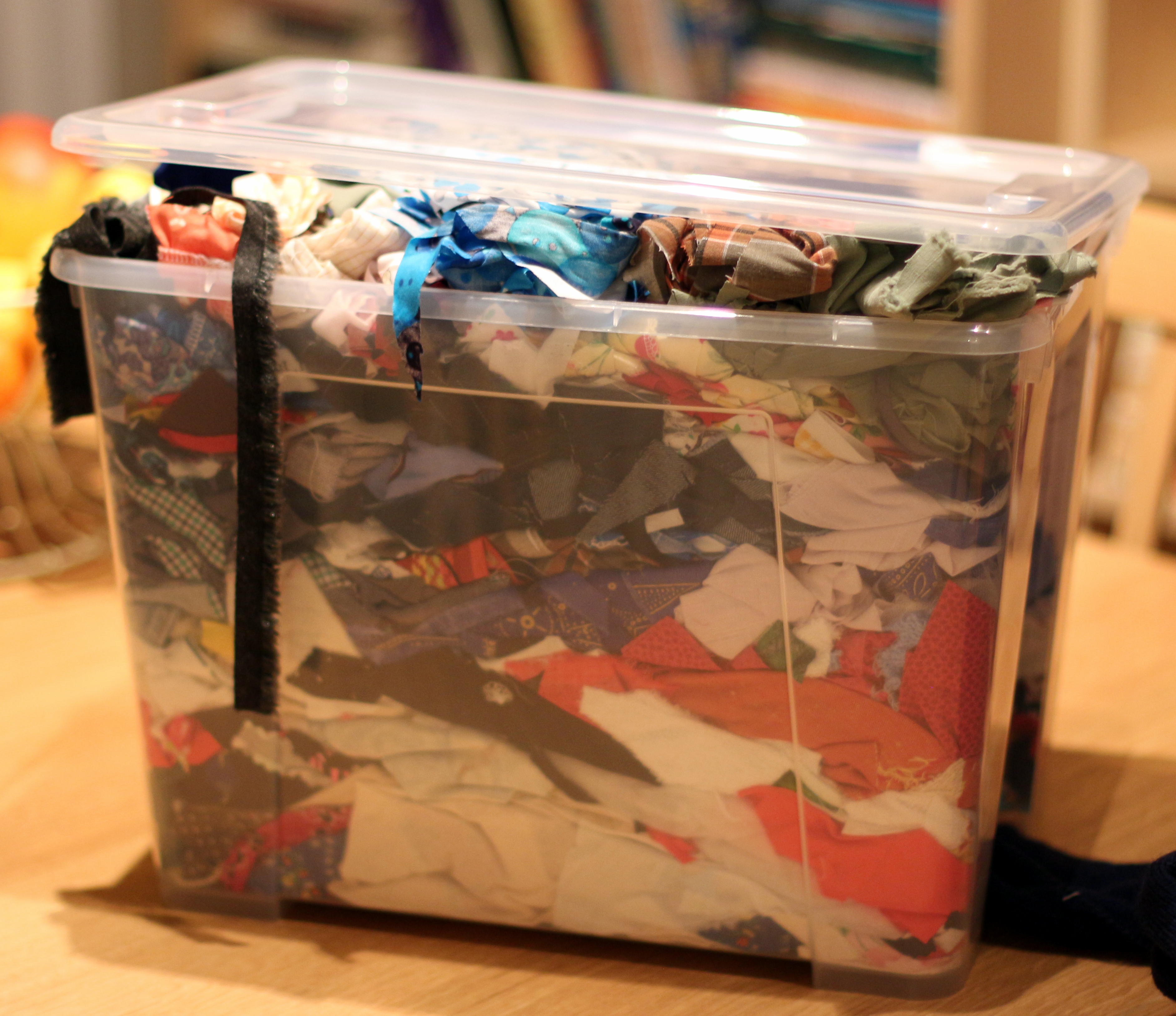 Meanwhile, I have been working away on a little project that involves this box of leftover teeny tiny scraps of material: