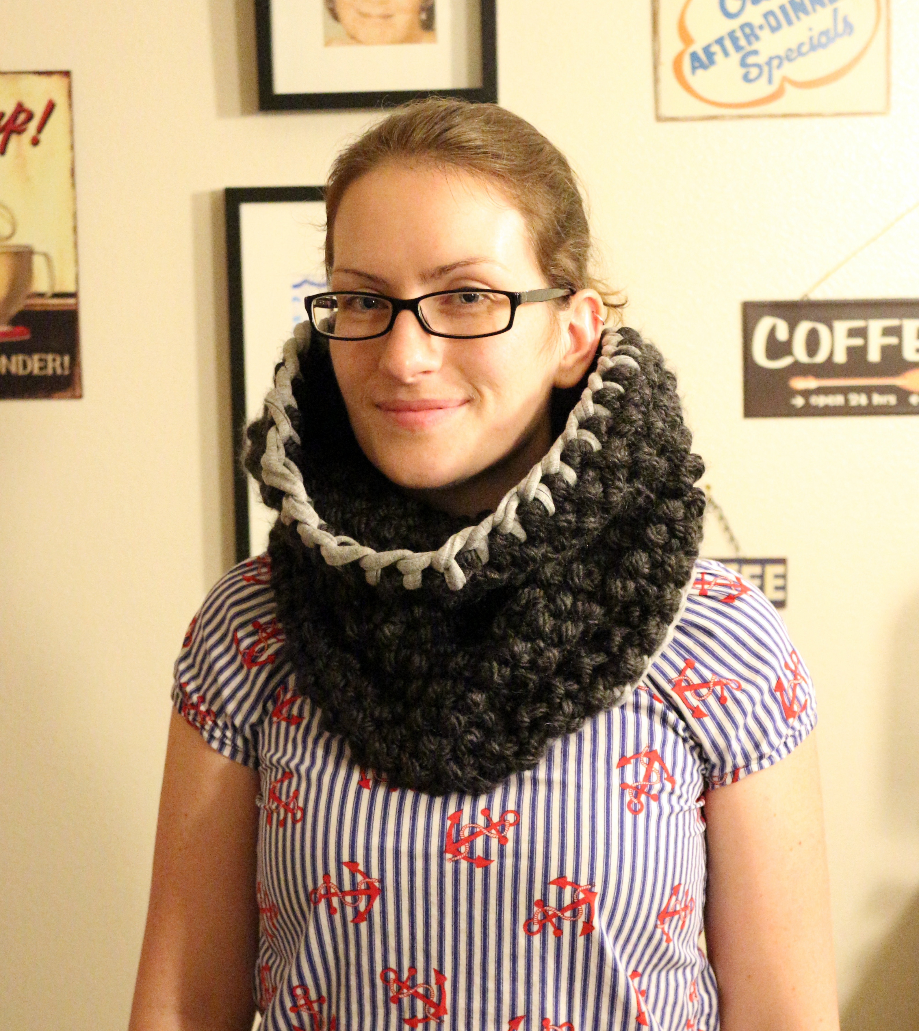 I knitted it up using just less than two skeins of Bernat Mega Bulky in Dark Grey Heather, which I bought on sale at Joann, and 15mm needles.