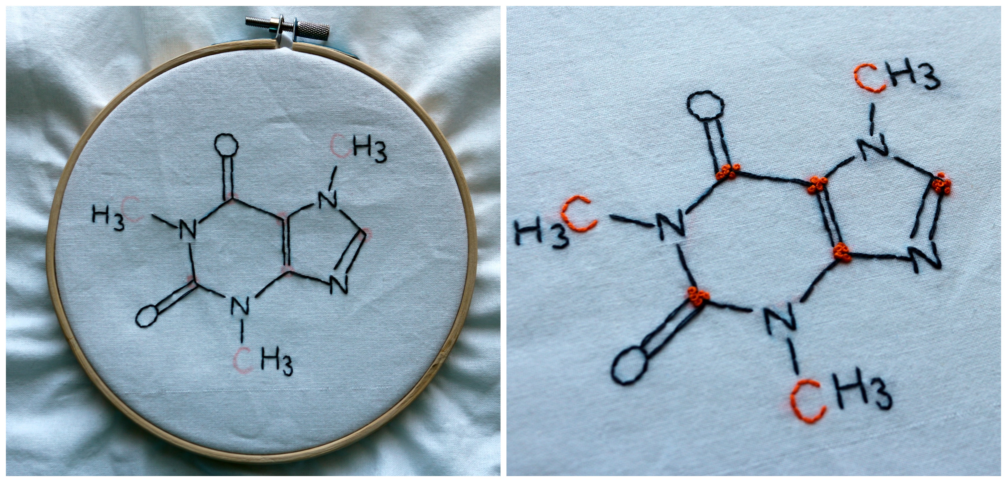 The stitching was then done using DMC 3799 for the blue lines, oxygen, nitrogen, and hydrogen atoms, and DMC 740 for the carbon, using simple straight stitching (holbein) and french knots: