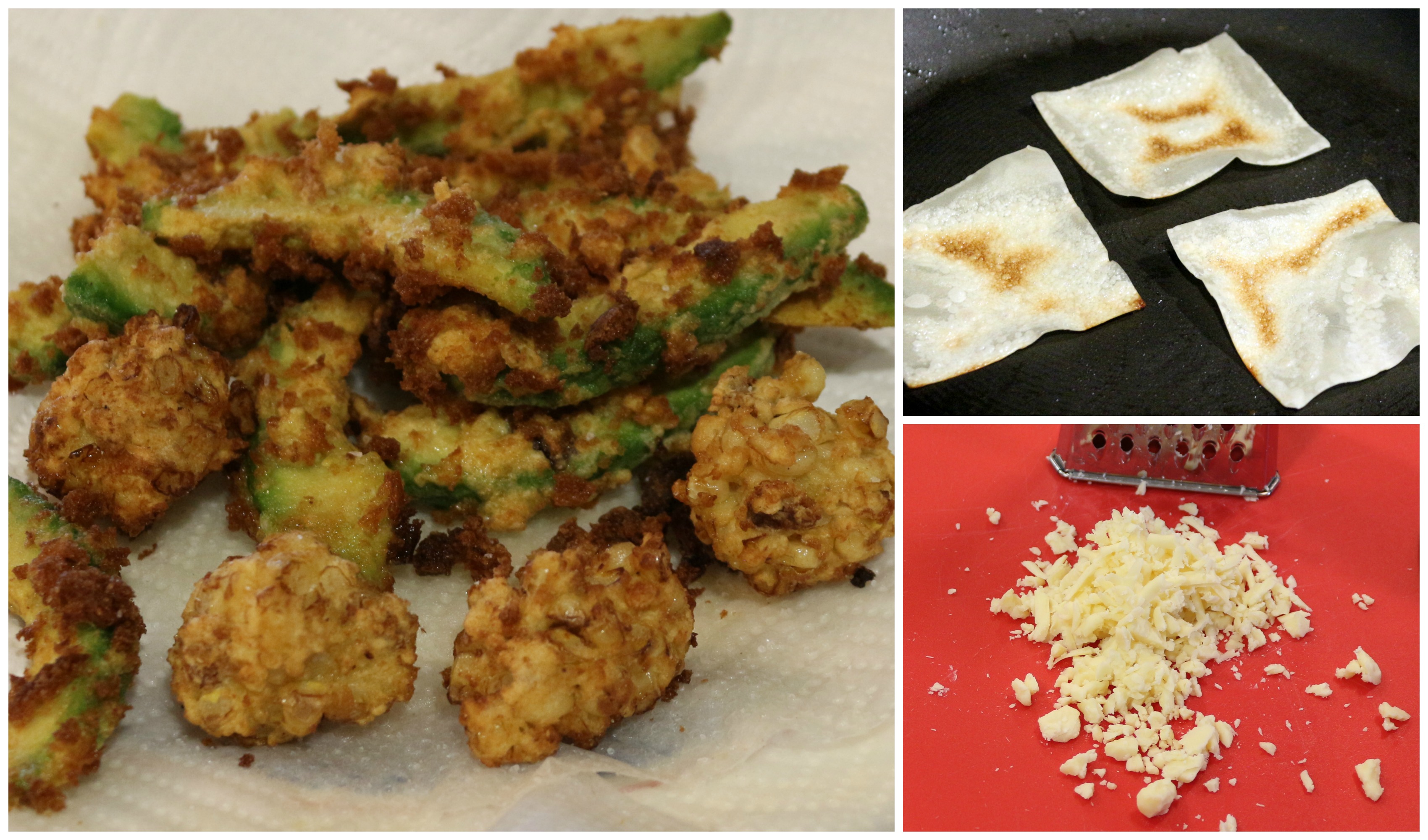 - Coat with panko (breadcrumbs), pressing to adhere.Note: steps 3-5 were followed for the avocado slices, but for the corn… we figured that individually coating kernels of corn with flour, egg, and breadcrumbs was going to be a little tricky, so instead, the remainder of the egg leftover after coating the avocado slices was combined with the corn, some flour, and breadcrumbs, to form small balls (kind of tater tot sized) for frying.