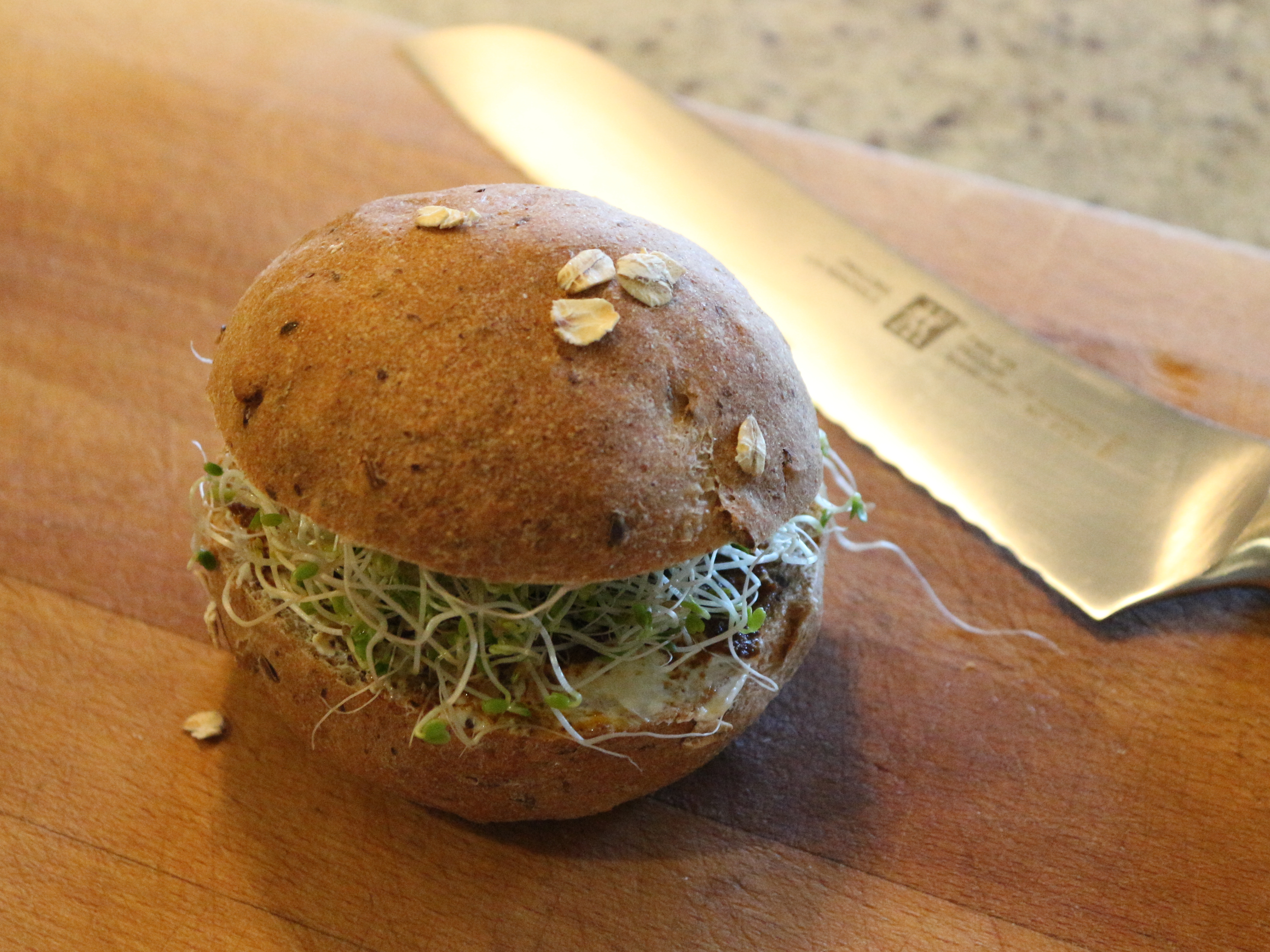 Today I had one for my lunch, filled with a bit of cream cheese, sundried tomato paste, and sprouts.