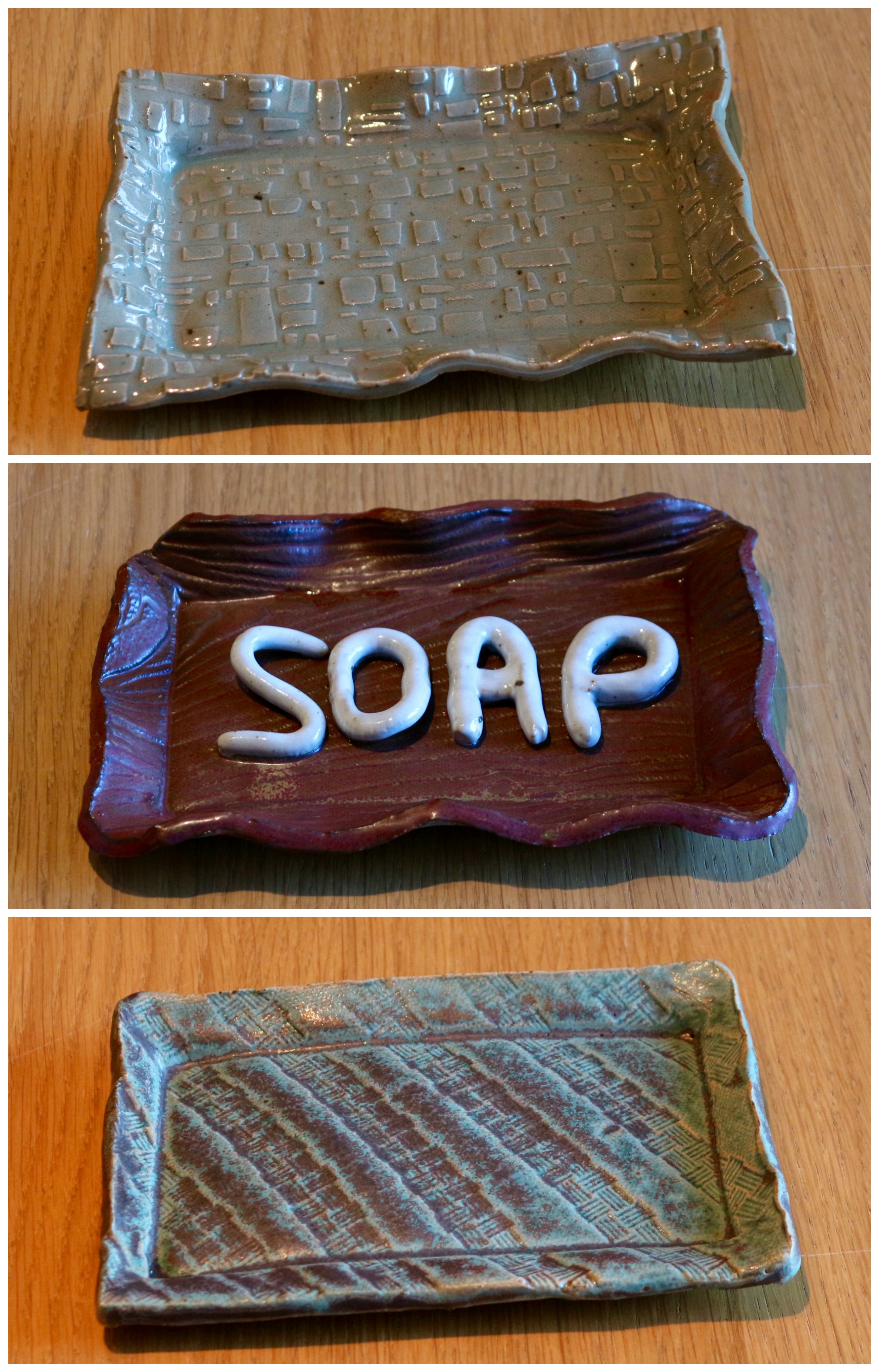“Push Plates” – Same as for the plates, we used slabs of clay, cut them into rectangles, imprinted them, then pushed them down into foam using a wooden block to shape them.