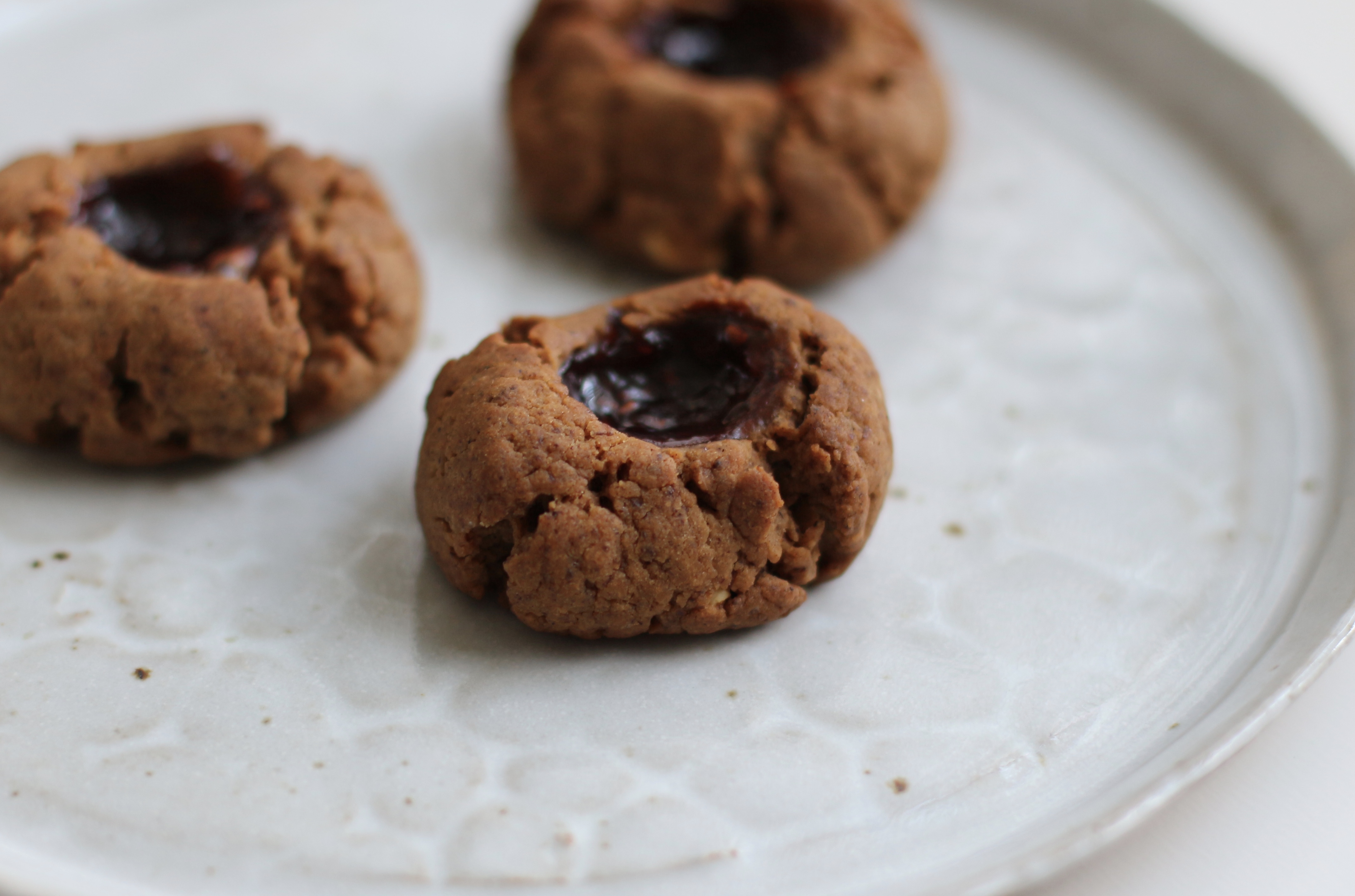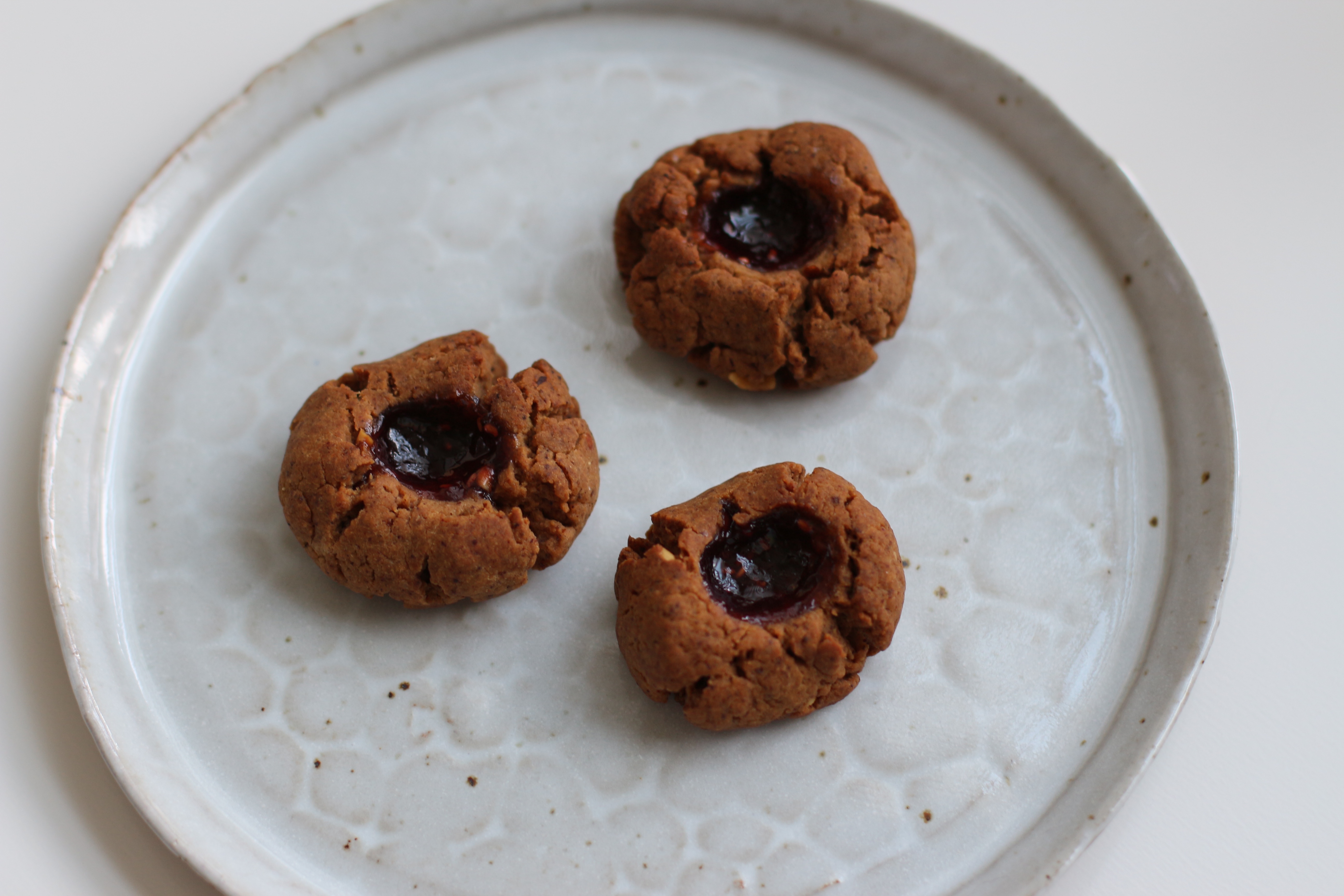 Form walnut sized balls of dough, and place on the prepared baking sheet (don’t be scared to put them close together, they don’t spread), then indent (or I prefer the term smoosh) the surface with your thumb, or the end of a wooden spoon.