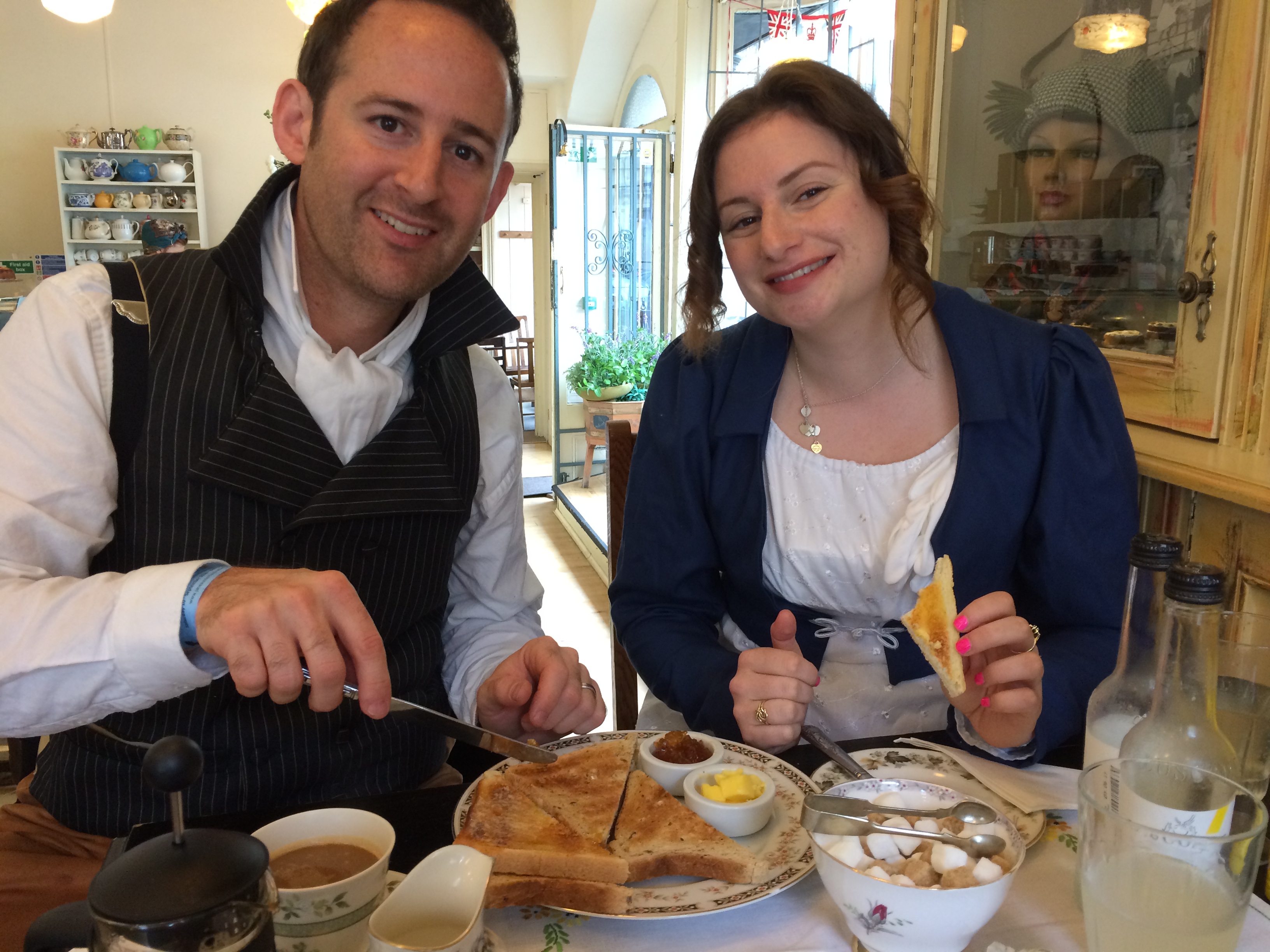 For the shirt we cheated and used a modern shirt – no one was going to see it anyway, and accessorized/covered up the neck using a simple cravat constructed pretty much according to the dimensions in this post. You can see it a little better in this picture, he took his jacket off while we were eating some breakfast pre-promenade… A scandal!