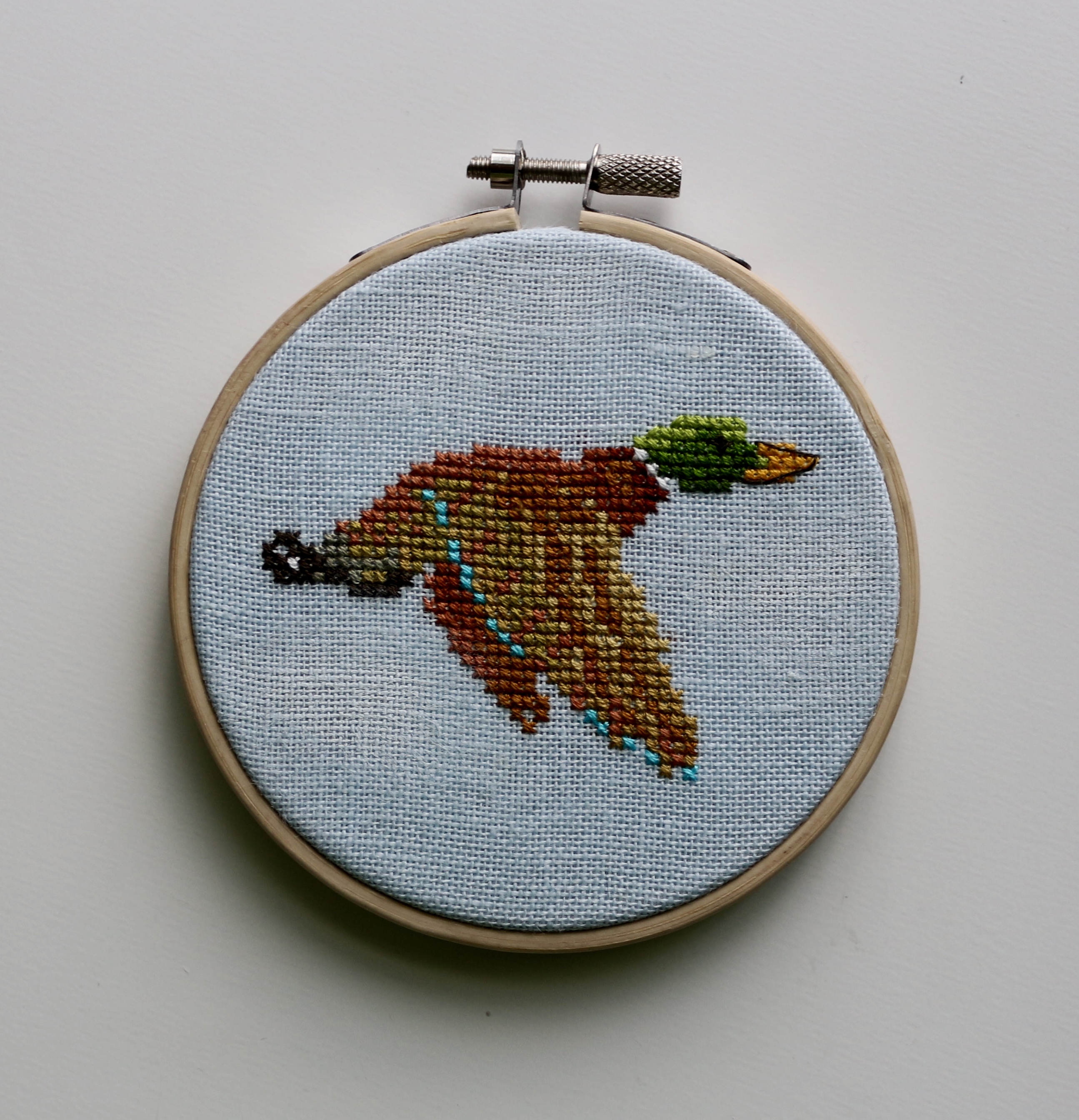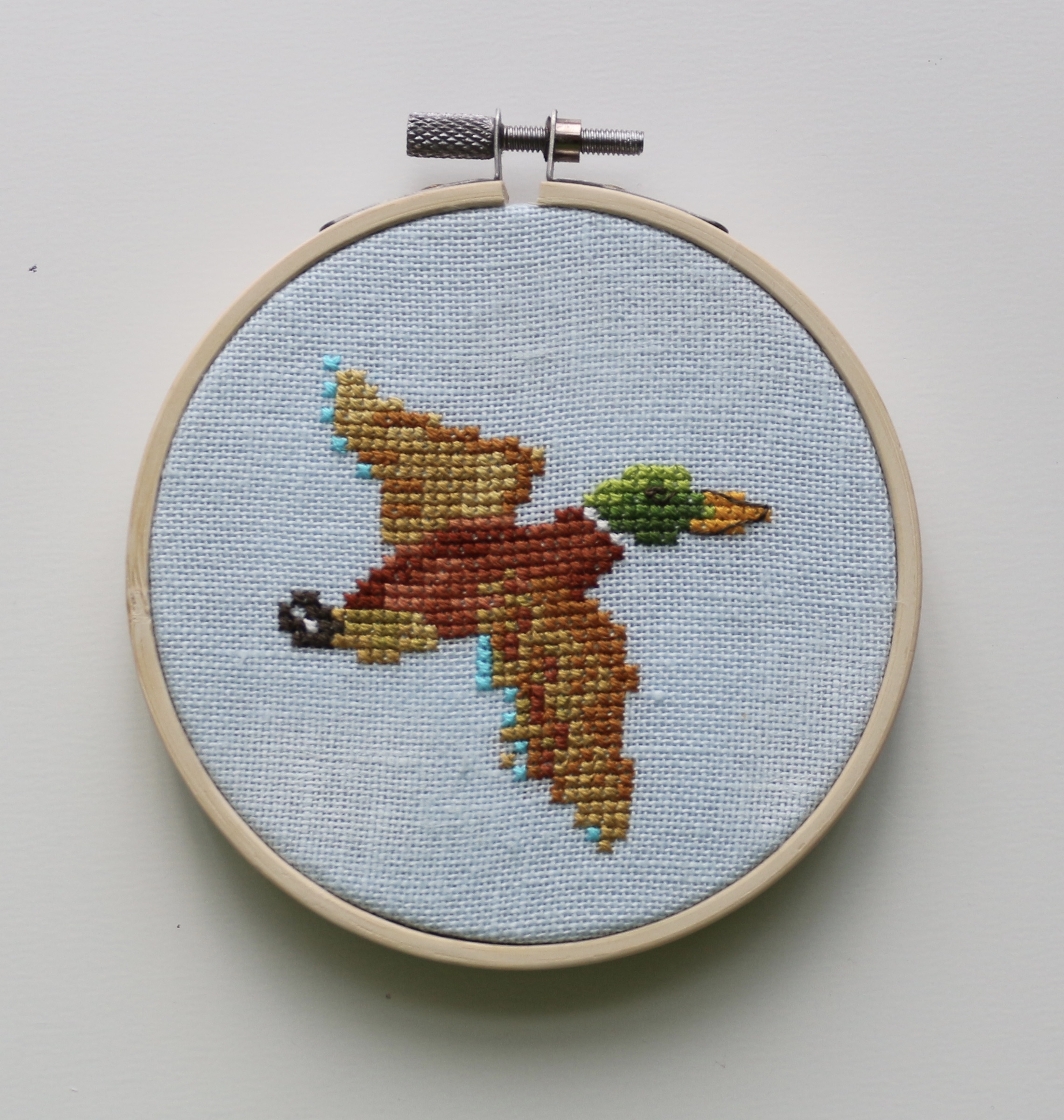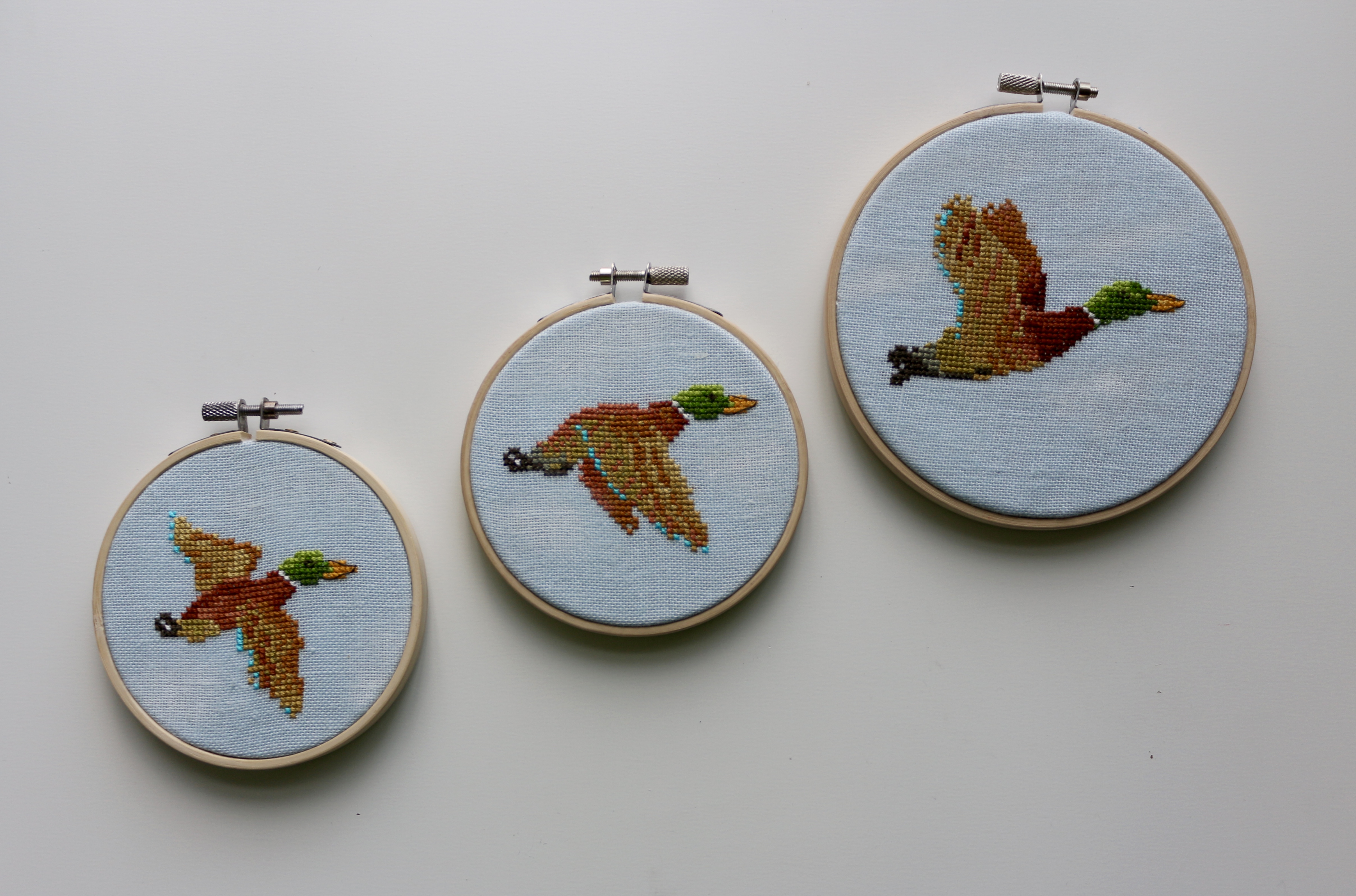 Part of the reason they were unfinished, was that I had half an idea to add a little bit of extra interest to the background. The ducks were stitched on a few leftover pieces of blue evenweave, so I grabbed a bit of white paint and a brush, and added some wispy clouds using just a light touch of paint. I’m not sure that it comes out that well in the pictures above, but I am happy with them, even with my limited artistic skills.